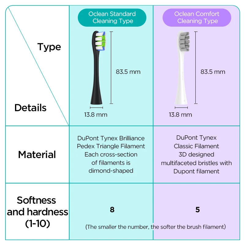 1. Oclean стандартный тип очистки DuPont Tynex Brilliance Pedex треугольная нить2. Каждое поперечное сечение нитей имеет алмазную форму и обеспечивает глубокое очищение, чистоту 20%.3. Пищевой полипропиленовый материал с сертификацией FDA для ухода за полостью рта4. Каждая нить была шлифована как полностью круглой, так и полукруглой.5. Высокая плотность плавления для более высокого уровня чистоты.6.3D разработаны многогранные щетинки с нитью Dupont для обеспечения оптимального уровня чистоты.7. Пищевая соска TPE материал, достаточно мягкий, чтобы очистить язык с покрытием