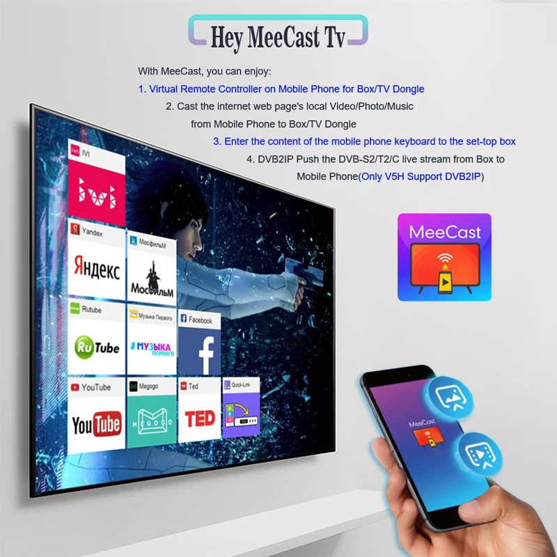 С MeeCast вы можете наслаждаться:1. Виртуальный пульт дистанционного управления на мобильный телефон для коробки/ТВ ключ2. Передайте локальное видео/фото/музыку на веб-странице в Интернете с мобильный телефон на ящик/ТВ-ключ3. Введите содержимое клавиатуры на мобильный телефон в телеприставки