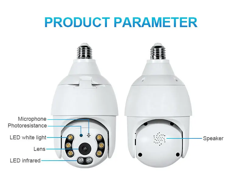 Датчик 2/3MP RGB 1/3 дюйма CMOSLens3.6 мм стандартный объектив, фиксированная дополнительная диафрагмаРазрешение 2MP или 5MPПанорамирование/Угол наклона: 270 ° Наклон: 90 °Мини чувствительность: 0.1LuxВидеокод stream32Kbps ~ 6 Мбит/сАудио формат g.711aПоддержка протокола TCP/IP, UDP/IP, HTTP, SMTP, FTP, DHCP, UPNP, NTPWiFi протокол 802.11b/g/nПоддержка ночного виденияИзображение поворачивающееся зеркало/инверсияАвтоматическая поддержка трекингаПоддержка обнаружения человека AIПоддержка управления видеоДвухстороннюю систему voiceSupportПоддержка обнаружения движенияАварийный сигнал по электронной почте/сигнал тревоги в реальном времениАудио channelBuilt-in MICПоддержка TF storageMax 128G tf-картаМощность supplyE27 110-240 ВОтходы питания <5 ВтРабочая температура-10 ℃ ~ 60 ℃Рабочая влажность 10% ~ 80% без конденсации