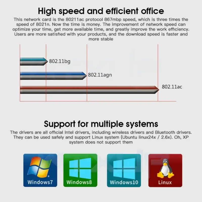 Сетевая карта имеет скорость 867 Мбит/с протокола 802.11AC, что в 3 раза выше, чем у 802,11 N. Эффективность работы значительно улучшается, пользователи более удовлетворены использованием ваших продуктов, а скорость загрузки быстрее и стабильнее.
