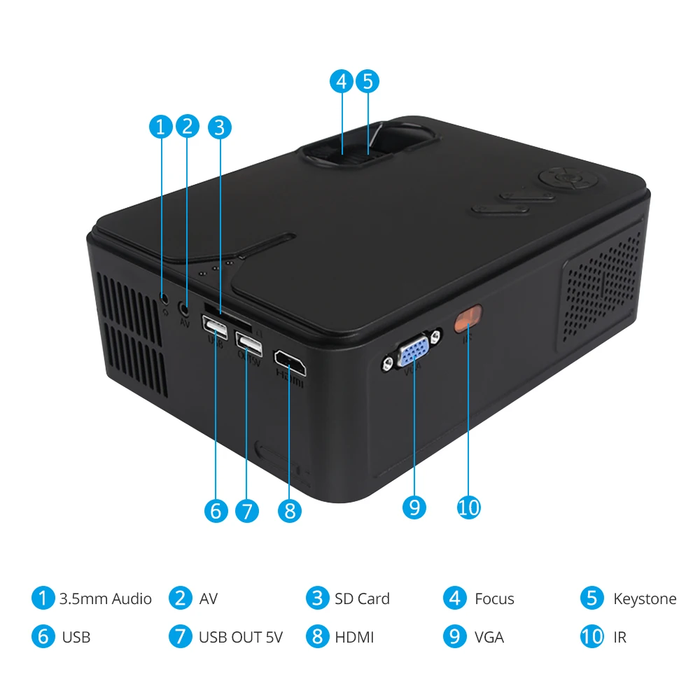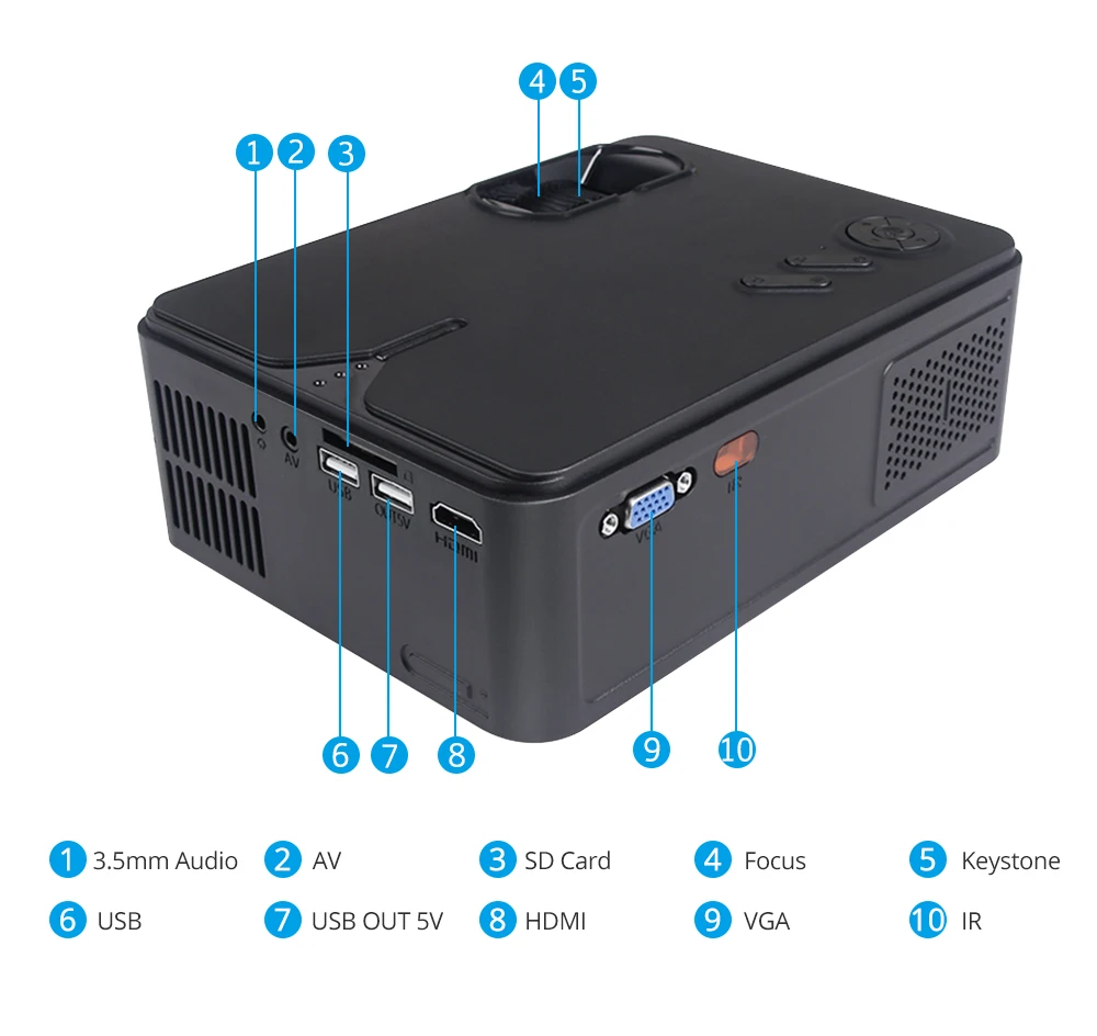Interface inputAV /HDMI/USB/VGA/SD/OUT 5V