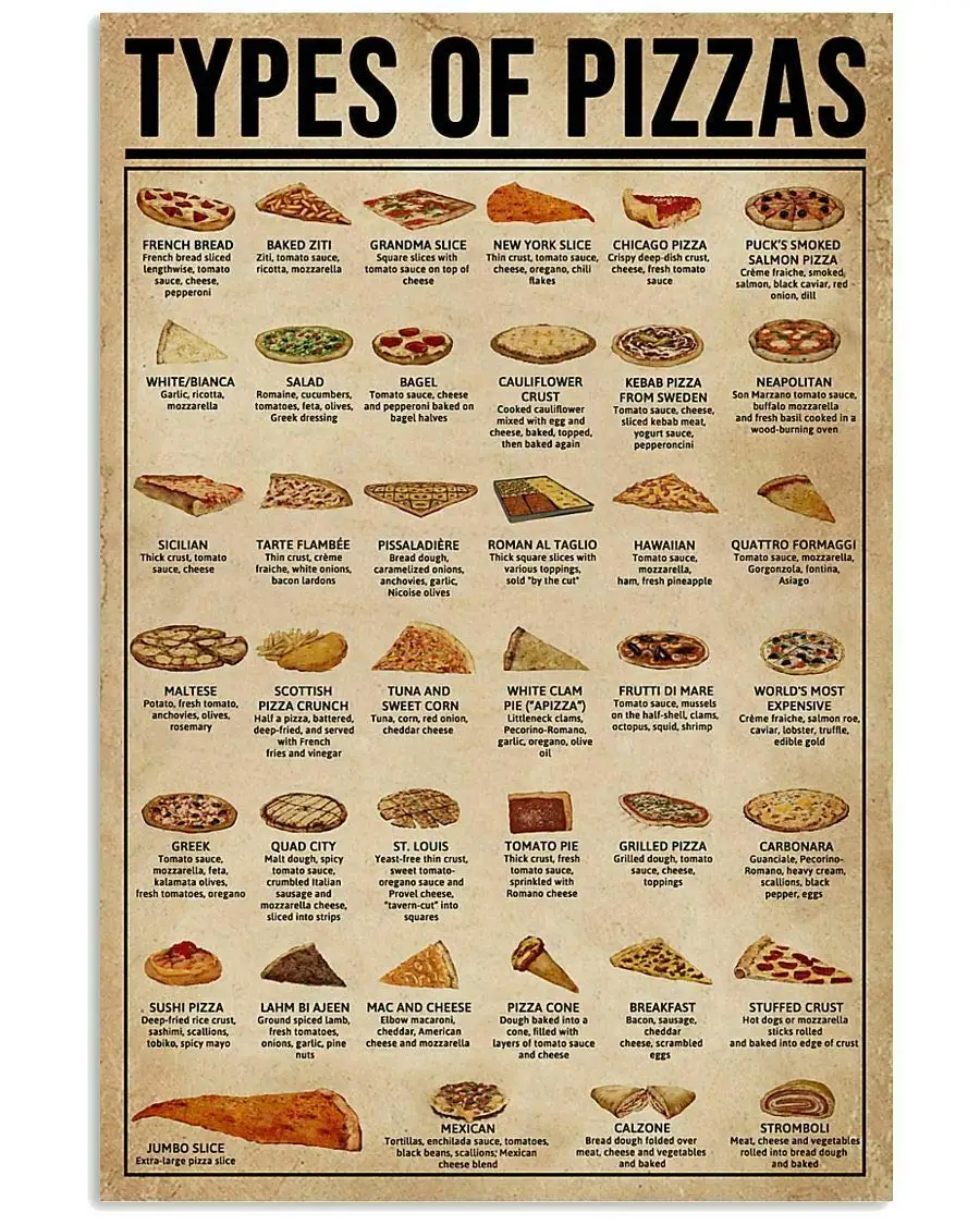 Типы пиццы Yummy для кухни, металлический жестяной знак, ретро-кухня, сад, ресторан, ферма, торговый центр, кафе, мужская пещера, ферма, стена