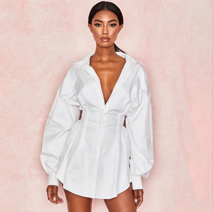 Для женщин, платье-рубашка, для деловой женщины, с буффами на рукавах, v-образный вырез с высокой талией Мини платье однотонное черно-белое подчеркнутой талией рубашка платье-туника