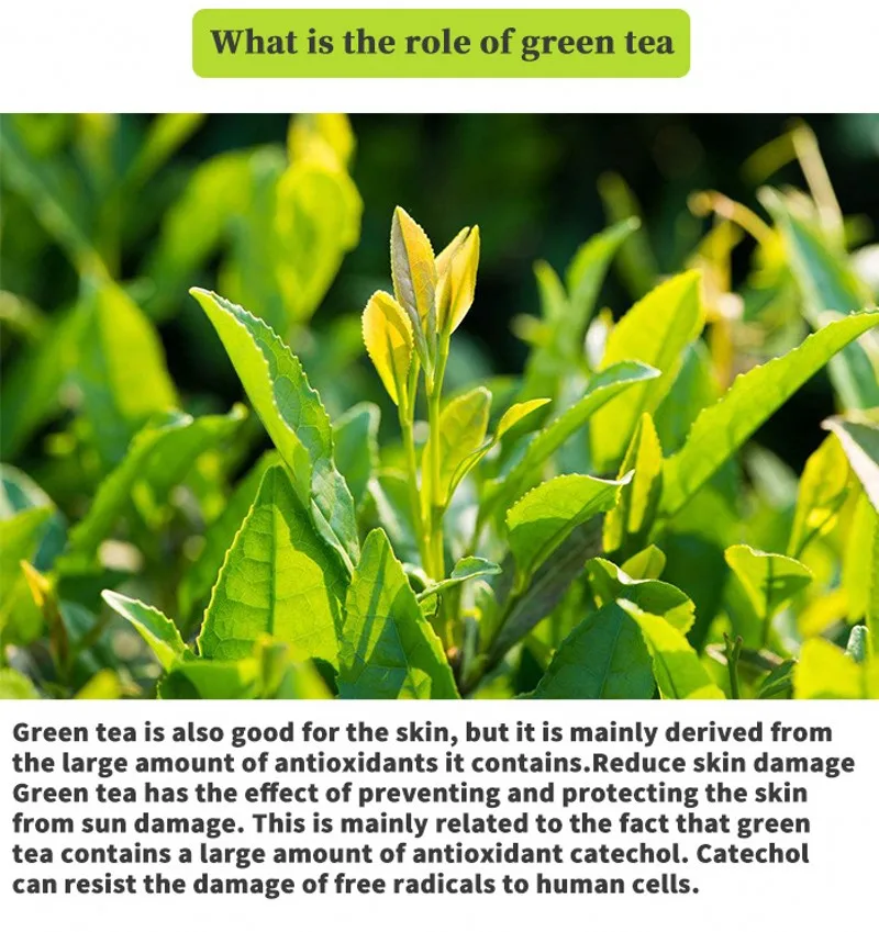 Ингредиенты зеленого чая: Зеленый чай также хорошо подходит для кожи, но в основном он исходит из большого количества антиоксидантов, которые он содержит. Уменьшает повреждение кожи Зеленый чай имеет эффект предотвращения и защиты кожи от солнечных лучей. Это в основном связано с большим количеством антиоксидантного катехола в зеленом чае. Катехол может противостоять повреждению свободных радикалов к клеткам человека.