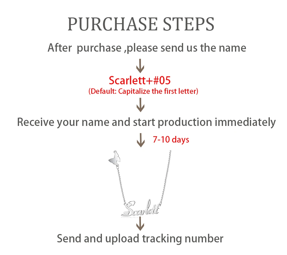 Пожалуйста, пришлите нам имя и шрифт, которые вы хотите заказать. Если вы не дадите нам имя по индивидуальному заказу, мы свяжемся с вами. Если вы все еще не ответите через три дня, мы сделаем ожерелье в соответствии с именем вашего получателя. Вы не можете отменить ваш заказ в течение 12 часов, потому что мы уже начали производство и надеемся получить ваше понимание У нас есть собственная Производственная фабрика, если вам нужна оптовая или Прямая поставка и оптовая торговля, пожалуйста, свяжитесь с нами.