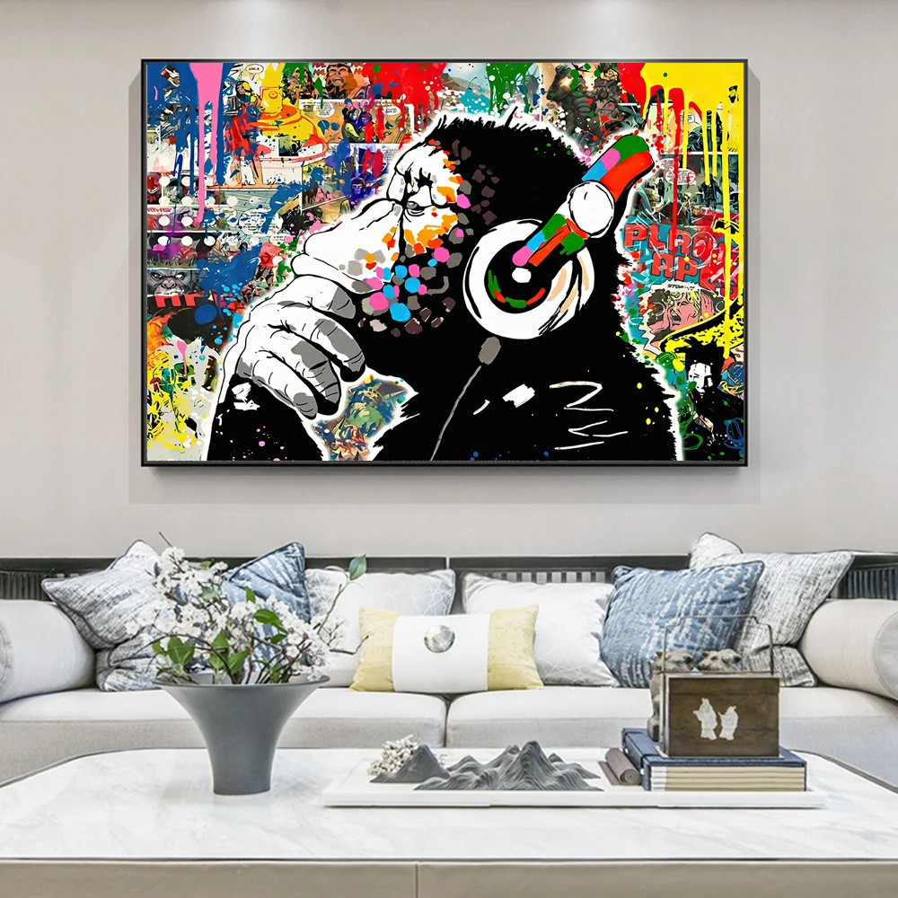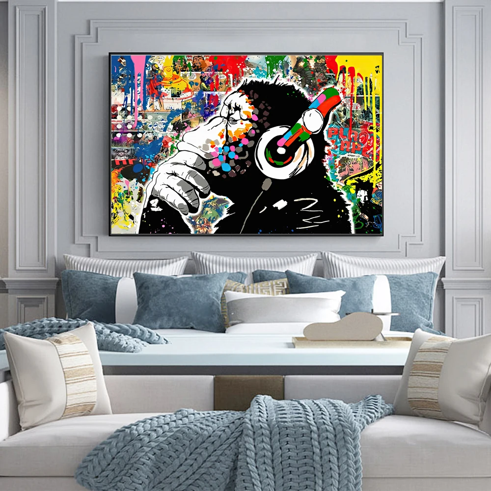 Обезьяна прослушивание музыки граффити искусство настенные картины художественные плакаты и принты животные уличное искусство картинки украшение дома