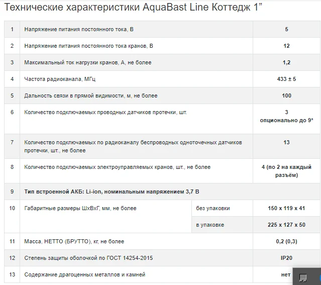 В комплект входит: контроллер защиты от протечек воды AquaBast C-RF. 1 шаровой кран с электроприводом, 12 В. 1 дюйм, корпус латунь литье, ручное открытие / закрытие, индикатор положения крана. 3 проводных датчика протечки, 1 блок питания на 5В. Система обеспечивает: контроль датчиков протечки и выдачу управляющих сигналов на перекрытие шаровых кранов в случае аварии (4 зоны контроля). Управление одной кнопкой, светодиодная индикация режимов работы и зон протечки энергосберегающий режим при работе от АКБ, звуковое и световое оповещение о протечке и авариях периферийных устройств. В комплект входит: Контроллер защиты от протечек AquaBast C-RF – 1 шт. Датчик протечки (проводной) – 3 шт. Шаровой кран с электроприводом 1 дюйм – 1 шт. Блок питания 5 В, 2 А – 1 шт. Комплект AquaBast Line Коттедж 1” обеспечивает: контроль датчиков протечки и выдачу управляющих сигналов на перекрытие шаровых кранов в случае аварии (4 зоны контроля) собенности AquaBast Line Коттедж 1” аварийное перекрытие крана по протечке; аварийное отключение насосов по протечке; автоматическая защита от закисания электроуправляемых кранов; анализ состояния проводных и беспроводных датчиков на наличие неисправностей (обрыв, потеря соединения, низкий уровень батареи); анализ состояния электроуправляемых кранов на наличие неисправностей (КЗ; заклинивание, выход из строя внутреннего концевика).