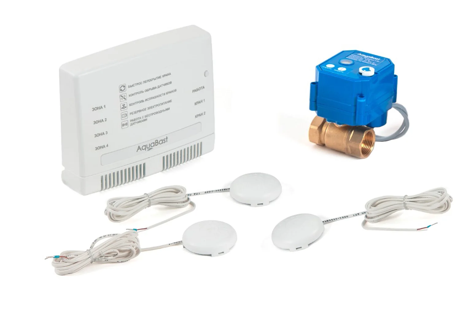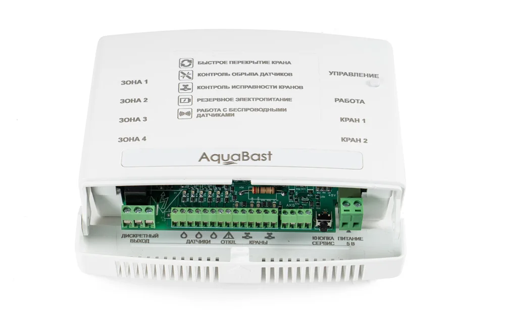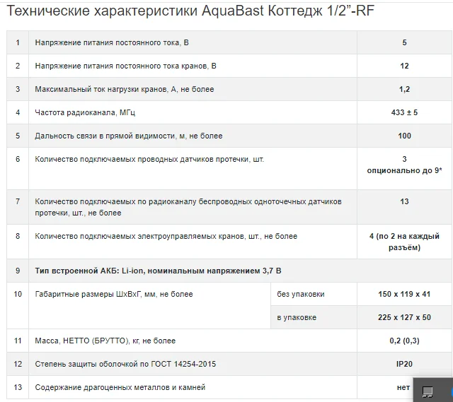 В комплект входит: беспроводной контроллер защиты от протечек воды AquaBast C-RF; 1 шаровой кран с электроприводом, 12 В, 1/2 дюйма, корпус латунь литье, ручное открытие / закрытие, индикатор положения крана; 2 проводных датчика протечки; 2 беспроводных датчика протечки (состоят из радиобазы и проводного датчика протечки); блок питания на 5 В. Система обеспечивает: контроль датчиков протечки и выдачу управляющих сигналов на перекрытие шаровых кранов в случае аварии (4 зоны контроля). Управление одной кнопкой, светодиодная индикация режимов работы и зон протечки, энергосберегающий режим при работе от АКБ, звуковое и световое оповещение о протечке и авариях периферийных устройств. В комплект входит: Беспроводной контроллер защиты от протечек AquaBast C-RF – 1 шт. Беспроводной датчик протечки AquaBast AB-1H-RF – 2 шт. Датчик протечки (проводной) – 2 шт. Шаровой кран с электроприводом ½ дюйма – 1 шт. Блок питания 5 В, 2 А – 1 шт. Беспроводной комплект AquaBast Квартира 1/2”-RF обеспечивает: контроль датчиков протечки и выдачу управляющих сигналов на перекрытие шаровых кранов в случае аварии (4 зоны контроля) Особенности AquaBast Коттедж 1/2”-RF аварийное перекрытие крана по протечке; аварийное отключение насосов по протечке; автоматическая защита от закисания электроуправляемых кранов; анализ состояния проводных и беспроводных датчиков на наличие неисправностей (обрыв, потеря соединения, низкий уровень батареи); анализ состояния электроуправляемых кранов на наличие неисправностей (КЗ; заклинивание, выход из строя внутреннего концевика).