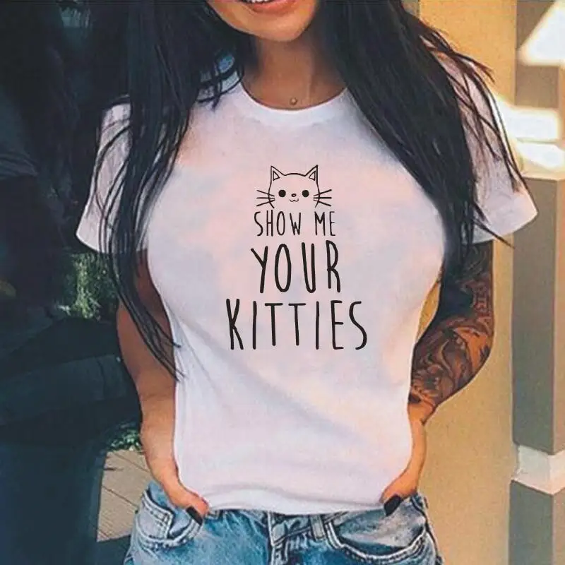 Футболка женская хлопковая свободного покроя, смешная с принтом Show Me Your Kitties, топ с коротким рукавом в стиле Харадзюку, на лето