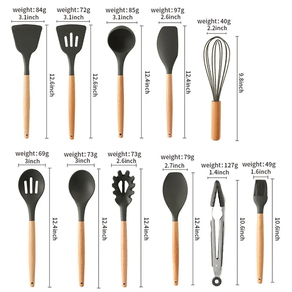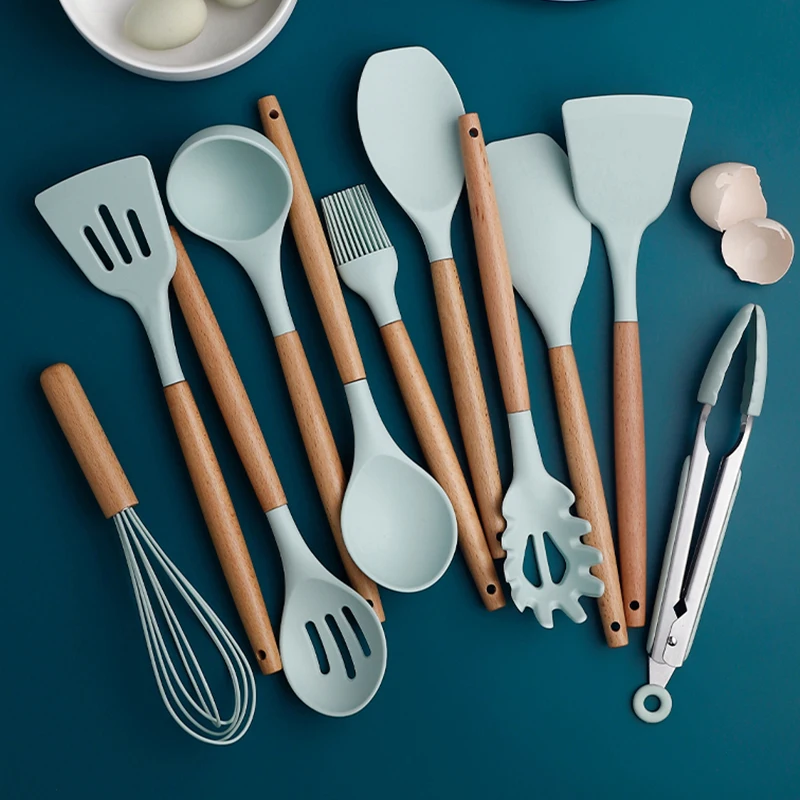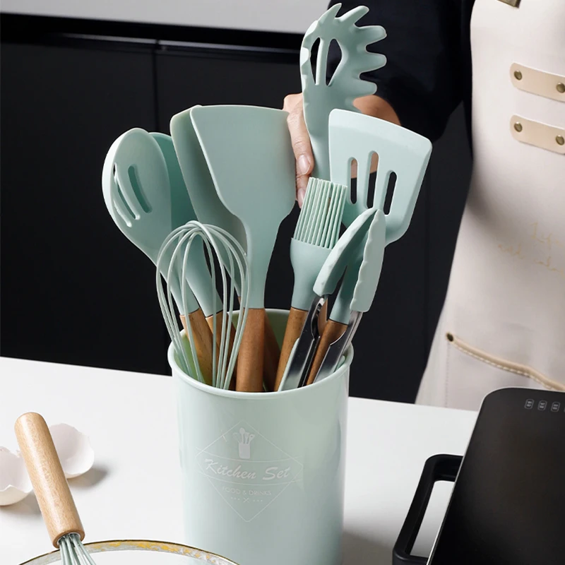1-12 шт. силиконовых кейсов Пособия по кулинарии Кухня набор посуды с антипригарным покрытием лопатка Черпак ложка с деревянной ручкой Пособия по кулинарии Набор инструментов с ящик для хранения
