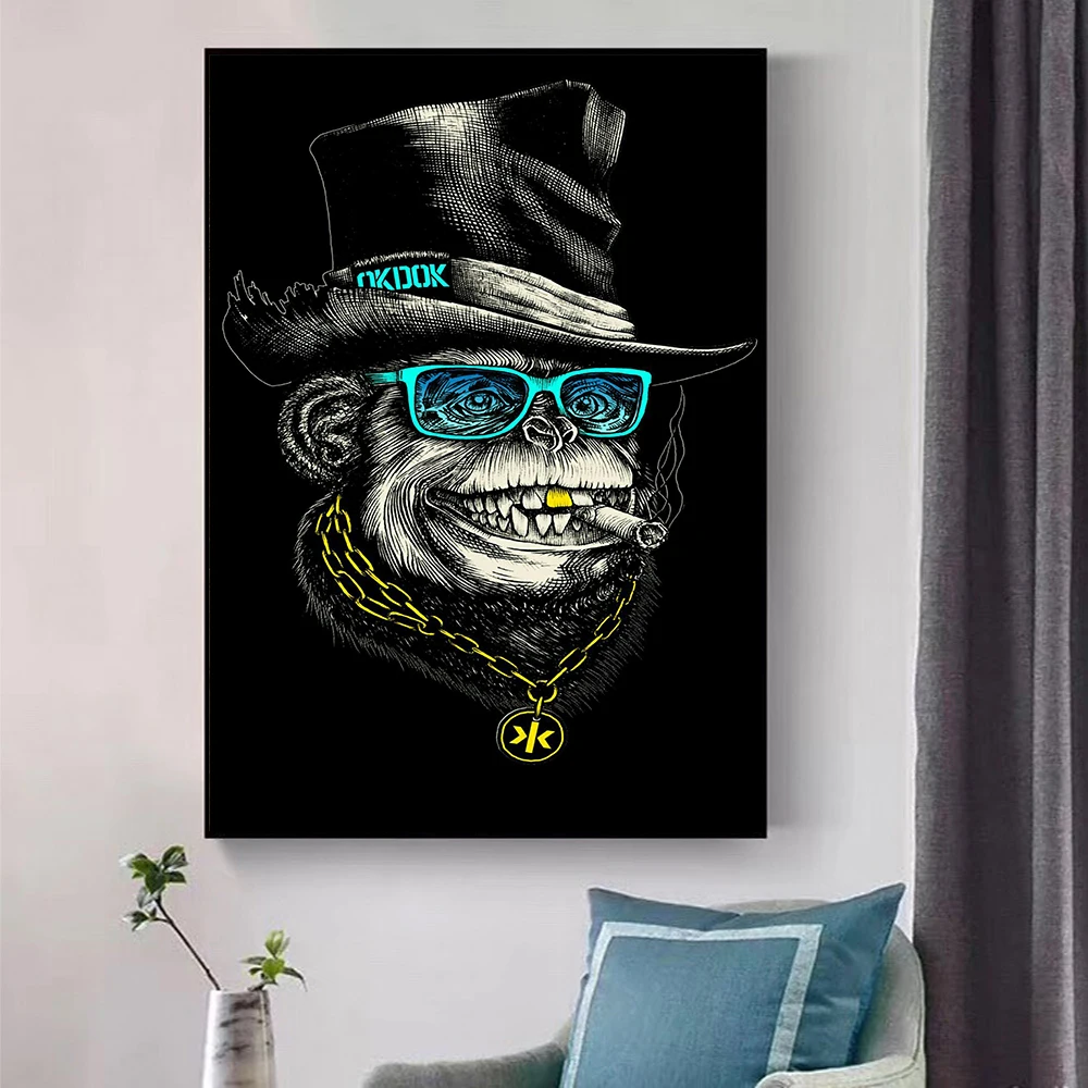 Забавный постер курительной обезьяны и печать черная шляпа и золотое ожерелье холст картина на стену животное картина Современный домашний декор