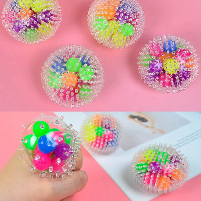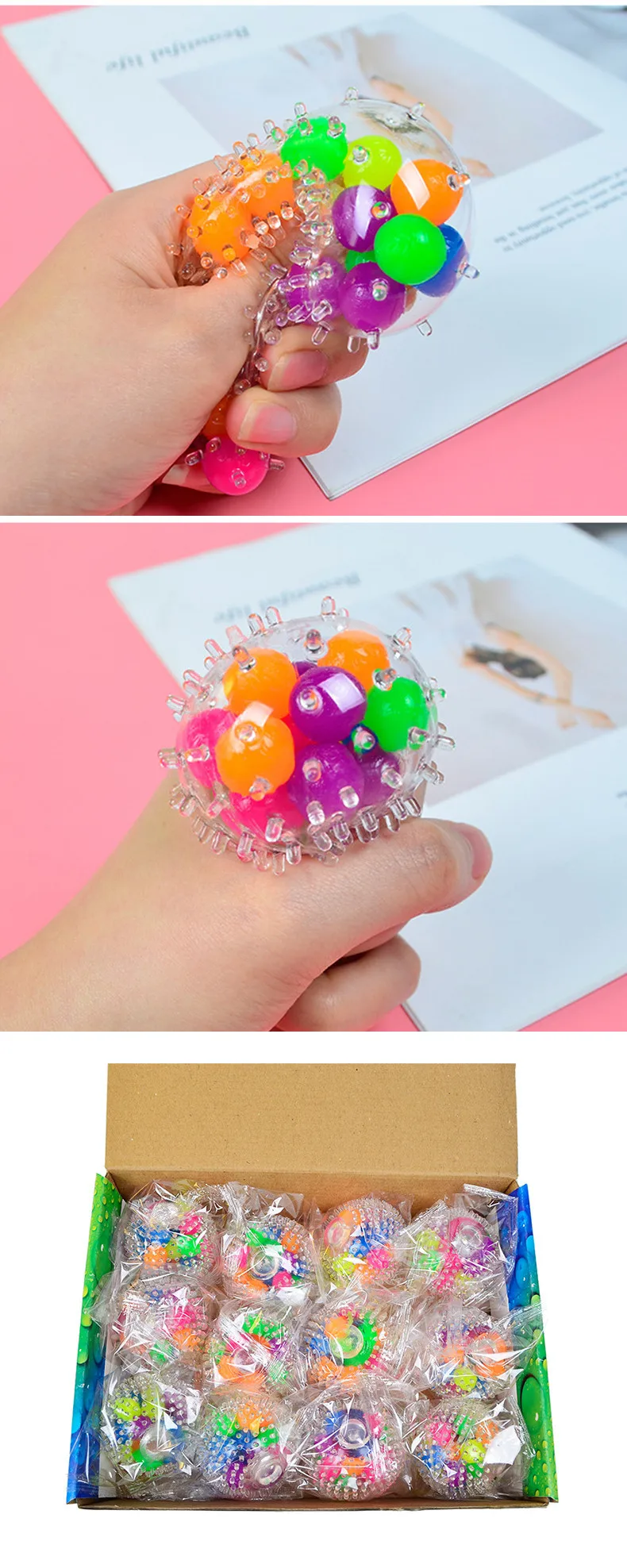 Упаковка: 2x разноцветных шара с заусенцамиРазмер: 6 см в диаметре, каждая из 20 мягких резиновых бусин из ТПР 1,2-1,5 смМатериал: ТПРХарактеристики продукта: эластичные, безвкусные, экологически чистые и нетоксичные, эластичные декомпрессионные игрушки
