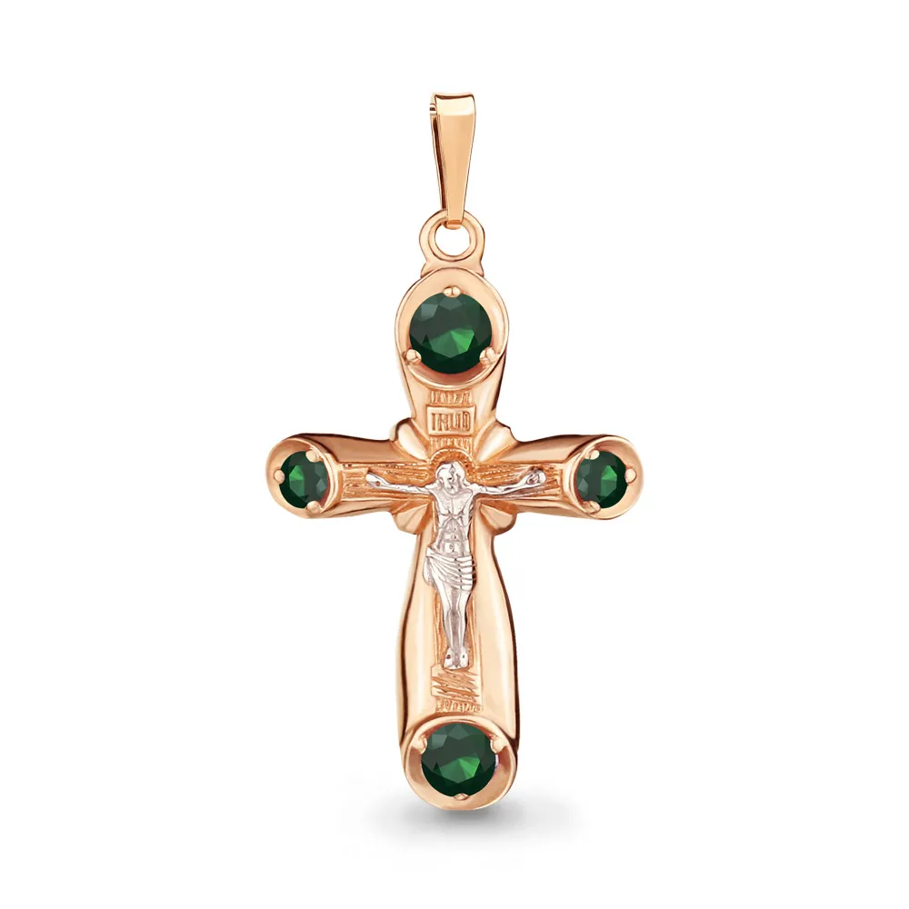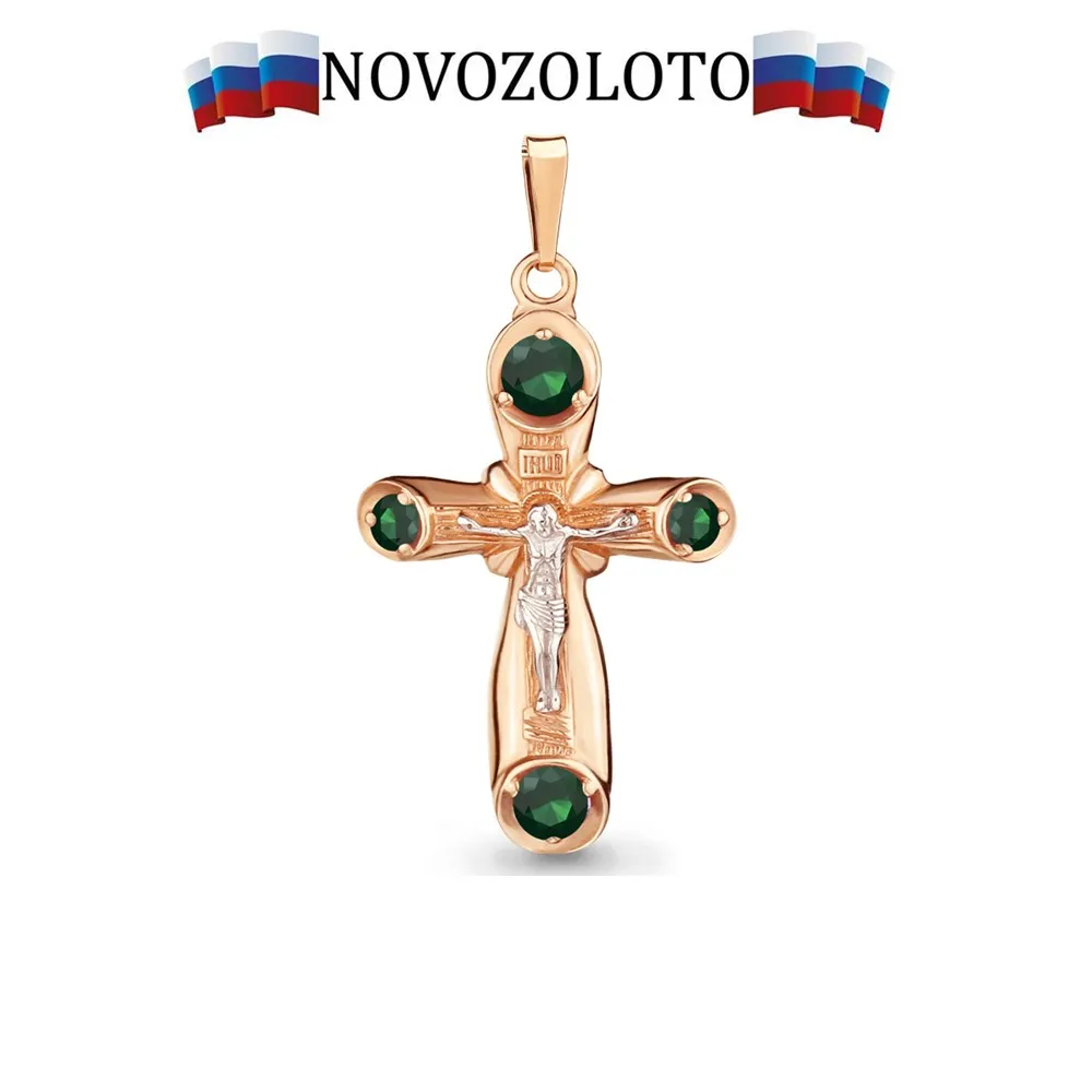 Подвеска тренд 2022 NOVOZOLOTO крест, серебро 925 пробы производство Россия, агат зеленый, покрытие золото, бирка завода