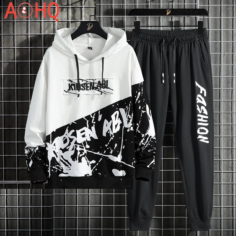 Корейский модный спортивный с напечатанной надписью в стиле хип-хоп, из кусков, мужские толстовки с капюшоном, Комплекты Одежда для улицы; Одежда для тонкий молодежная мода спортивный костюм комплект из 2 предметов