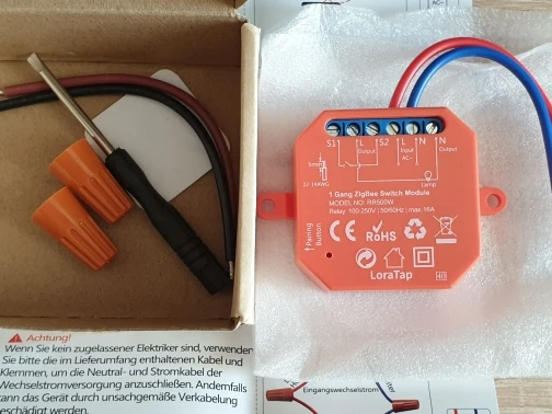 Подключается к домашнему ассистенту через CC2652RB zigbee stick без проблем. Модуль подходит для розетки, но он немного больше. Поставляется с гибкими маленькими кабелями для подключения, что делает его удобным