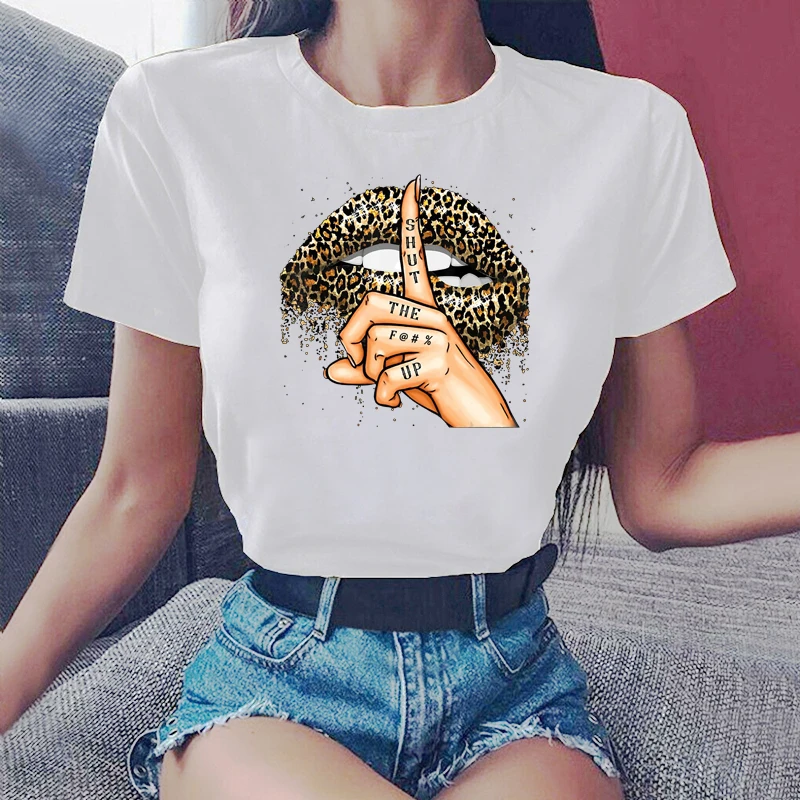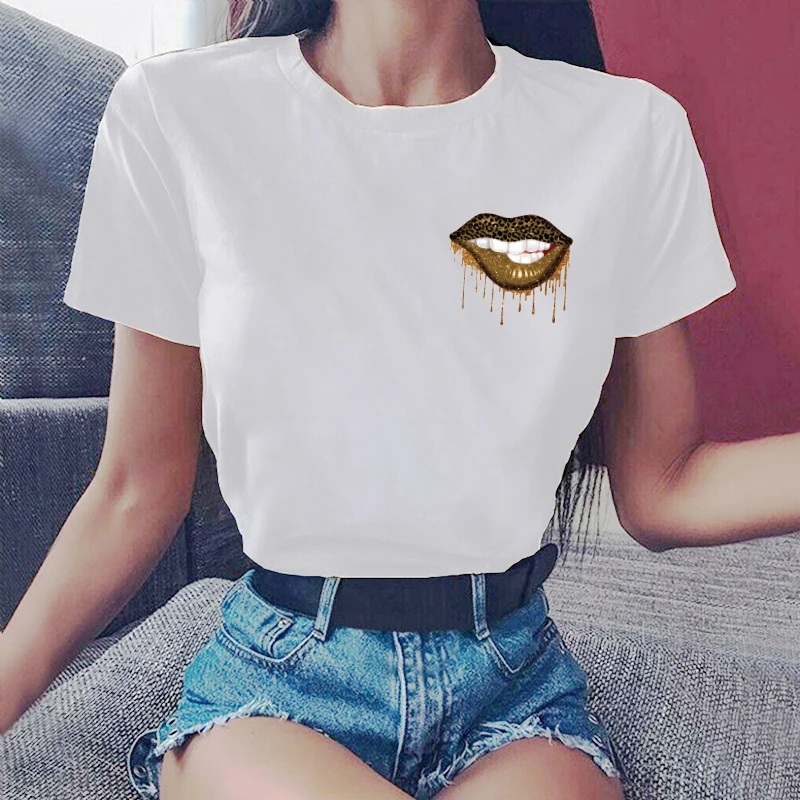 Женская футболка с леопардовым принтом, летняя футболка с круглым вырезом и принтом губ