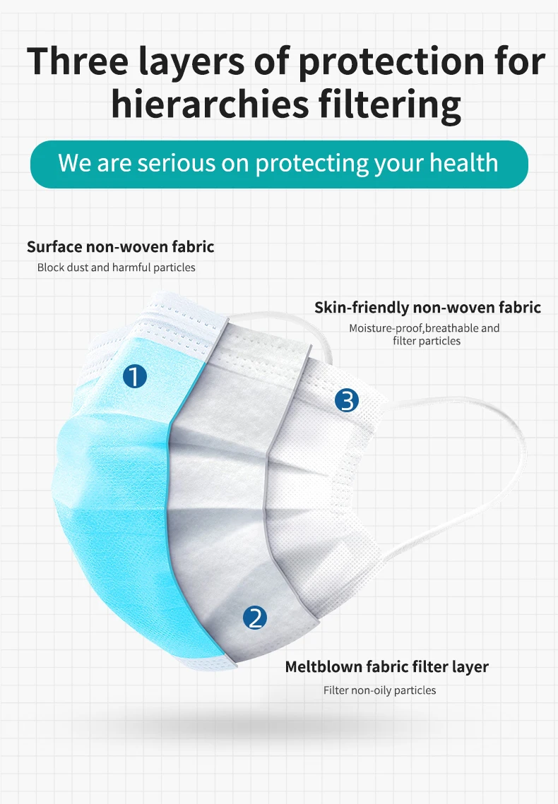 1,3 слоев защиты. Внешний слой: нетканый (предотвращает попадание поролоновой пыли). Средний слой: медицинская мелтдувная ткань выше 95 уровня. Трехмерная сетчатая фильтрующая структура. Фильтрует более 95% бактерий. Внутренний слой: нетканый (мягкий дышащий, приятный для кожи).