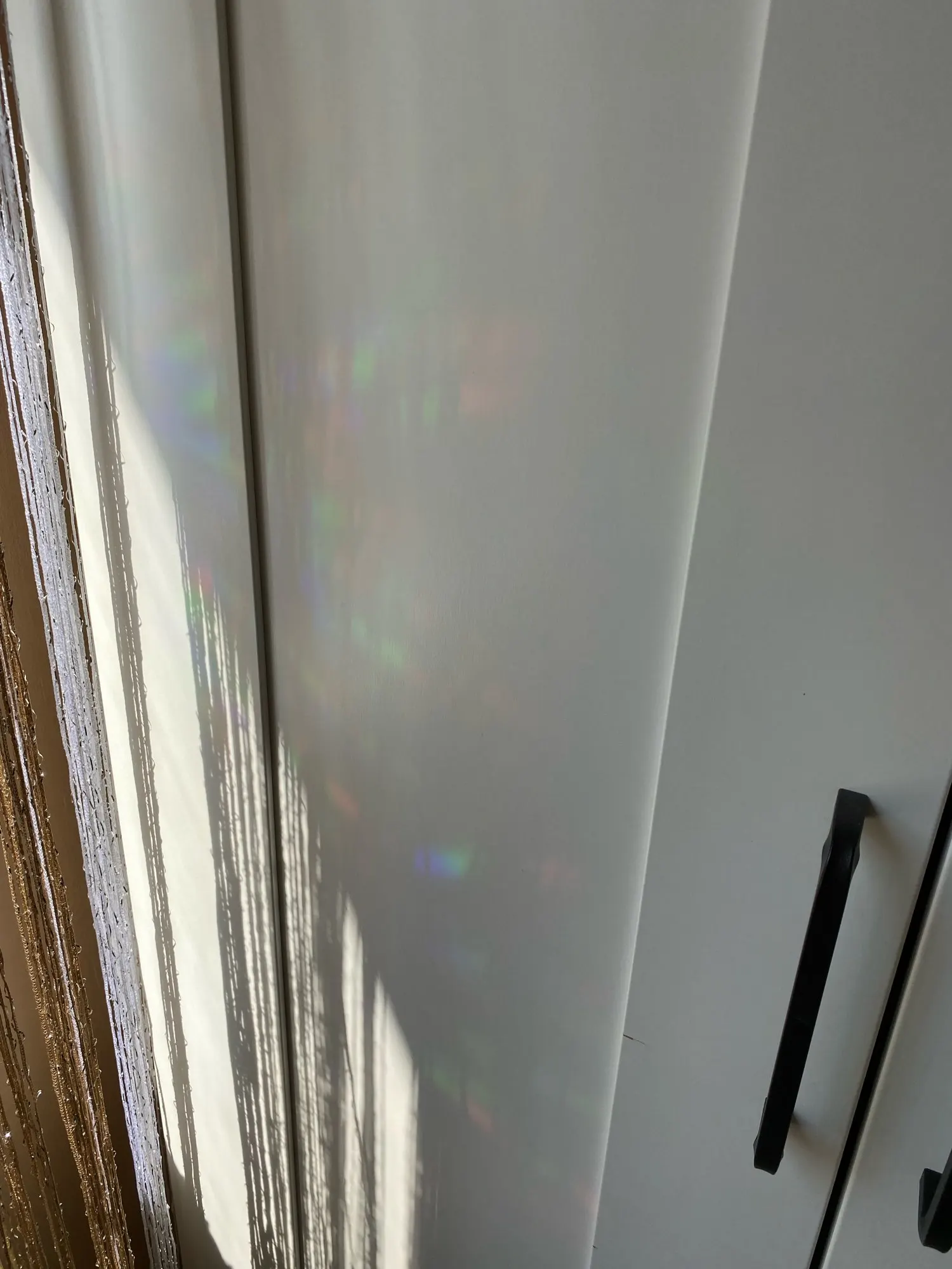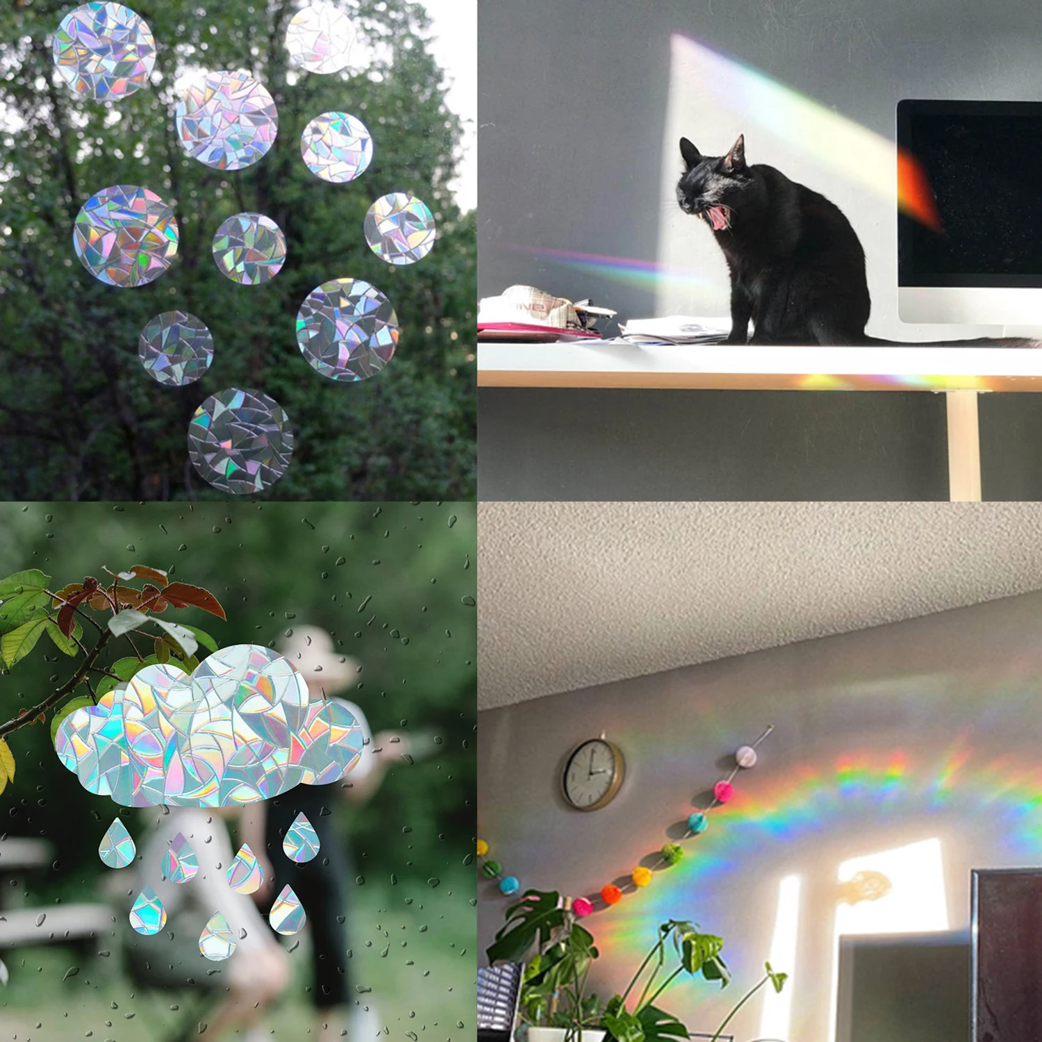 Совершенно нет того эффекта, ради которого я заказывала наклейки. Никакой радуги не создаёт, просто висят на стекле. И приехали ужасно мятыми, разрезаны криво. Разочарование (