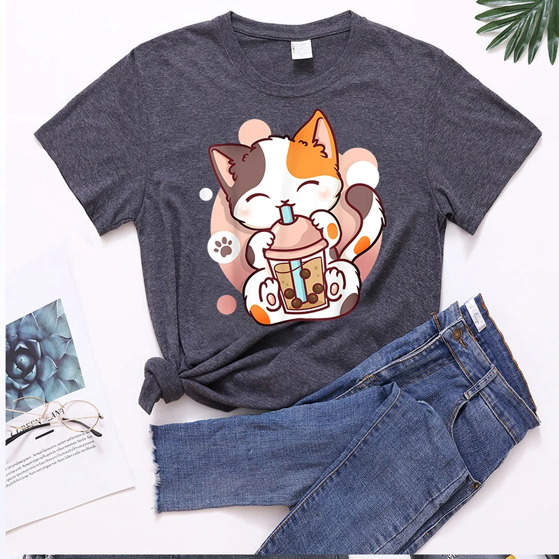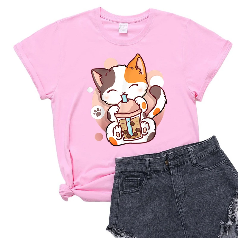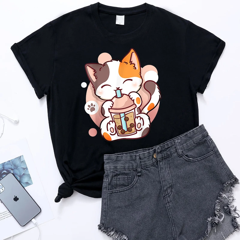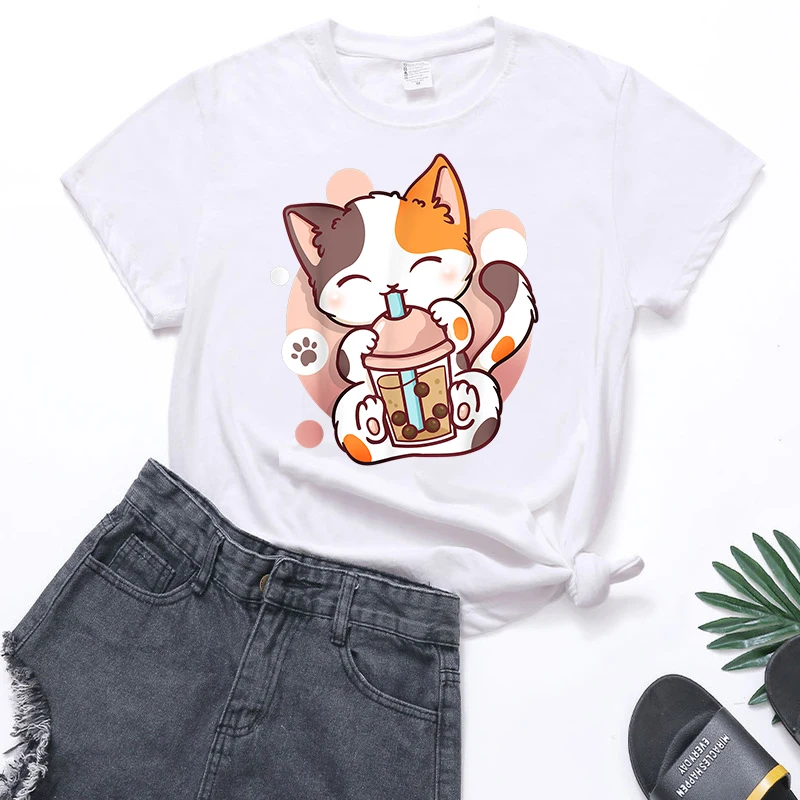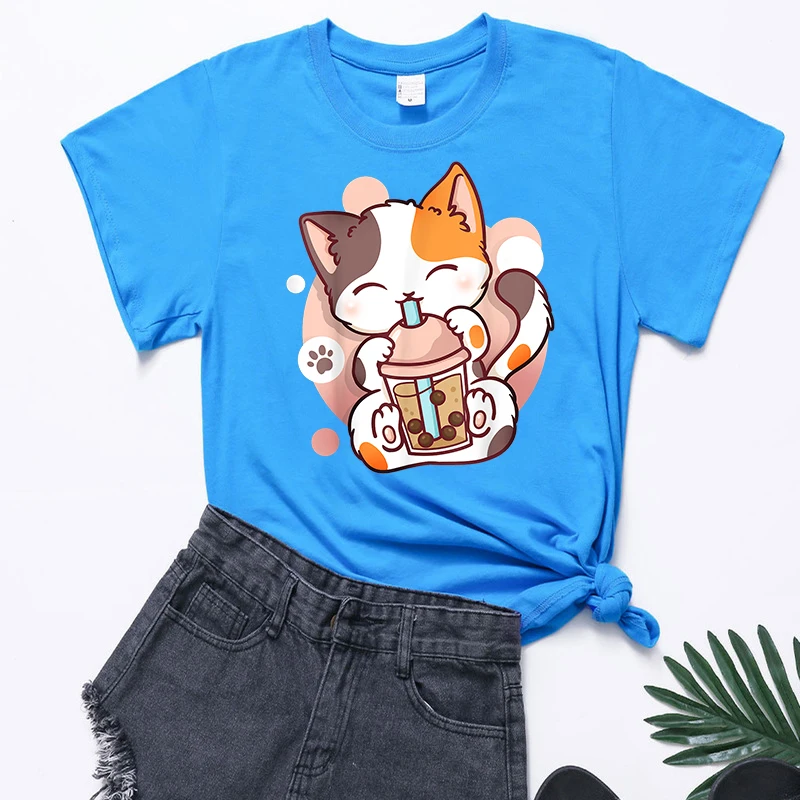 Футболка унисекс из 100% хлопка с изображением кота Боба чая с пузырьками чая аниме Kawaii Neko, летняя женская футболка с короткими рукавами, высокое качество