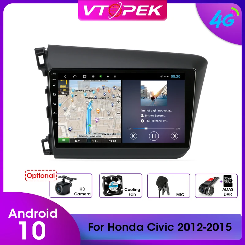 Автомобильная Мультимедийная система Vtopek, на Android 10,0, с 9 "экраном, GPS, Wi-Fi, 4G, видеоплеером, для HONDA CIVIC 2012-2015