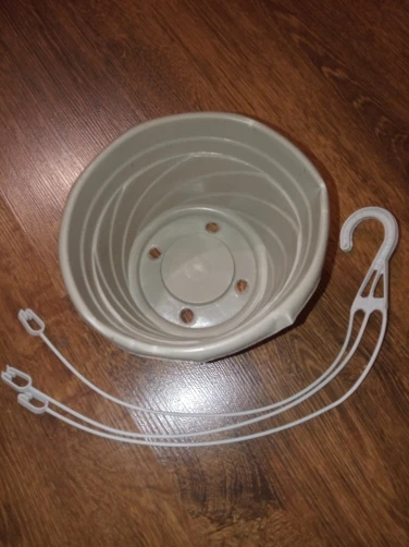 Горшок маленький, верх. диаметр то 14см. Сам пластик очень тонкий, поэтому весь гнутый и искажённой формы. И держатели непонятно выпрямятся ли вообще. Думала белый цвет, получила серо- беж. Мне не понравился. За такие деньги с доставкой можно купить хороший горшок лучшего качества.