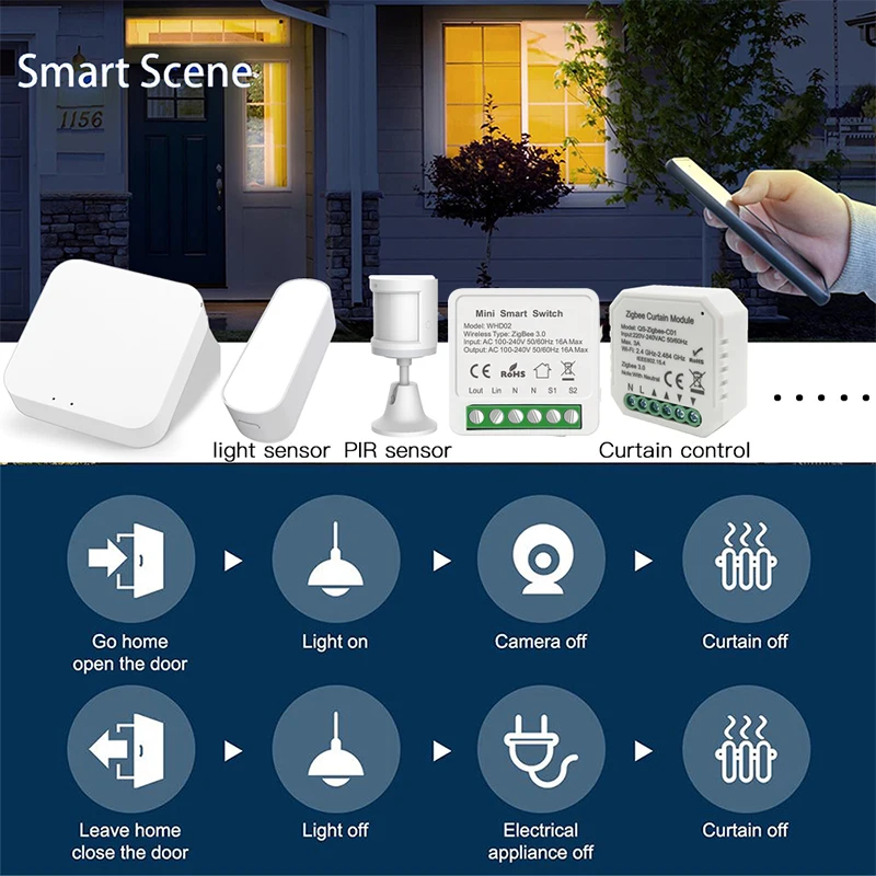 Умный шлюз Zigbee может управлять всеми датчиками zigbee светильник световыми модулями, шторками. Он имеет большую емкость более сильный сигнал, чем wifi. Когда вы приходите домой, вам не нужно ничего делать, свет загорится, занавес выключится автоматически. Датчики PIR светильник, дверей и окон будут обнаруживать движение в режиме реального времени.