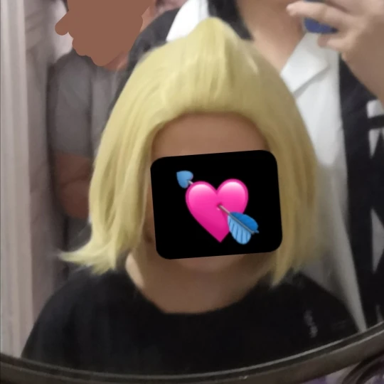 обычный дешёвый парик, с начесом на макушке и передней части. качество самого волоса хорошее, не лезут. парик в первоначальном виде стремный, факт. определённо нужна укладка, чтобы выглядело более менее нормально. плюс ещё оказался короче, чем я ожидала. позже добавлю фотографии уже с укладкой, а сейчас держите фотку мелкой сестры и такеоми.