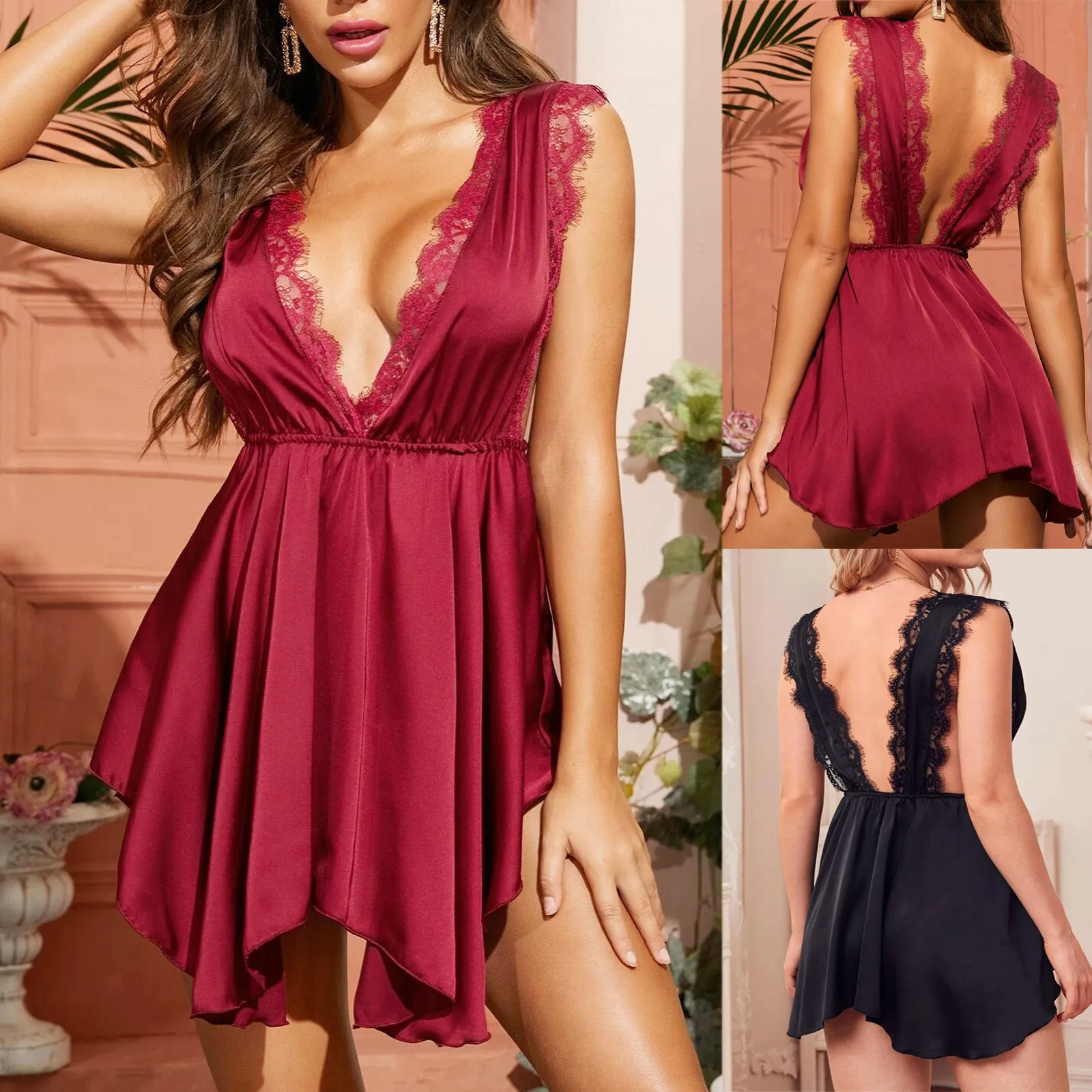 Для женщин, нижнее белье, одежда для сна, женские пеньюар сексуальное нижнее белье Ночная сорочка из кружева с глубоким v-образным вырезом Холтер Нерегулярные Новая одежда для сна Детское Белье для сна