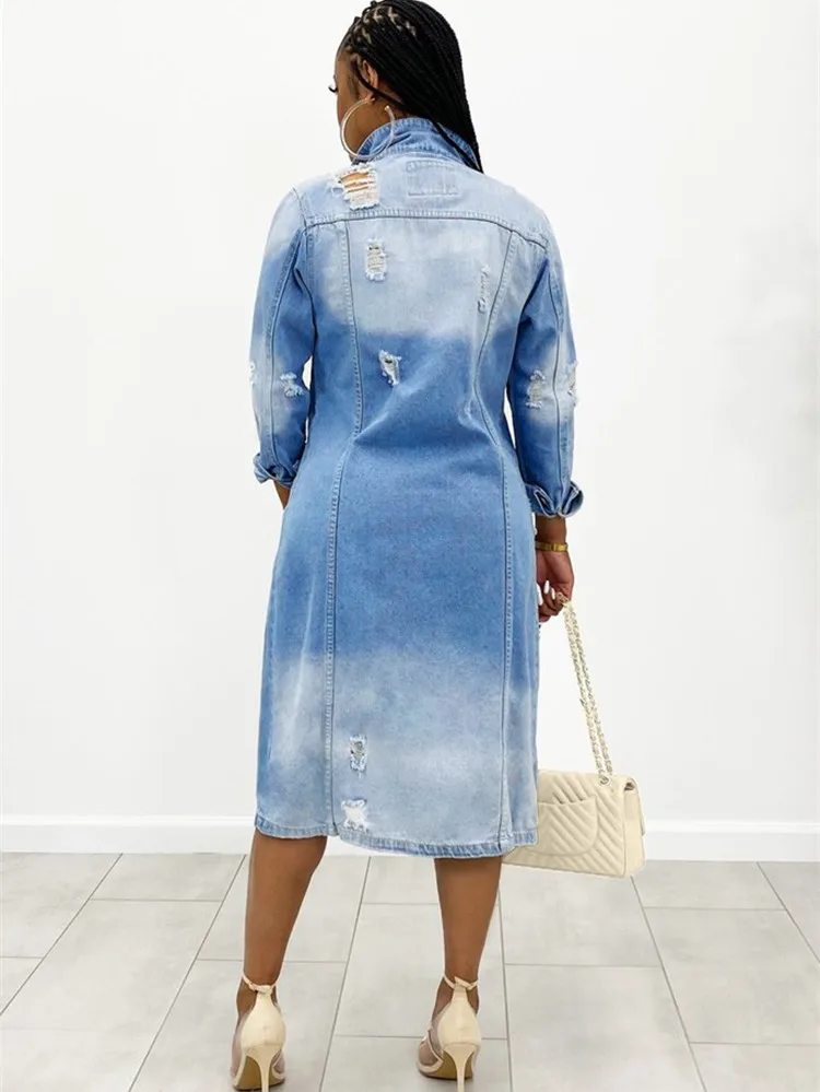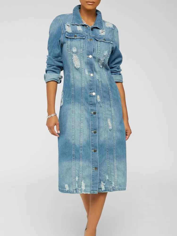 Женская длинная джинсовая куртка, рваная верхняя одежда с отложным ...
