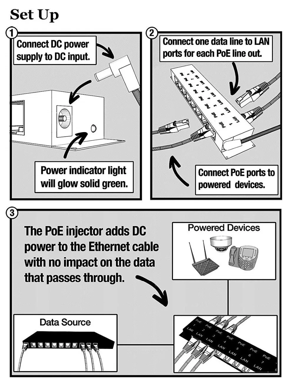 1. Панель 8 интегрирует пассивный Инжектор POE подходит для питания до восьми устройств.