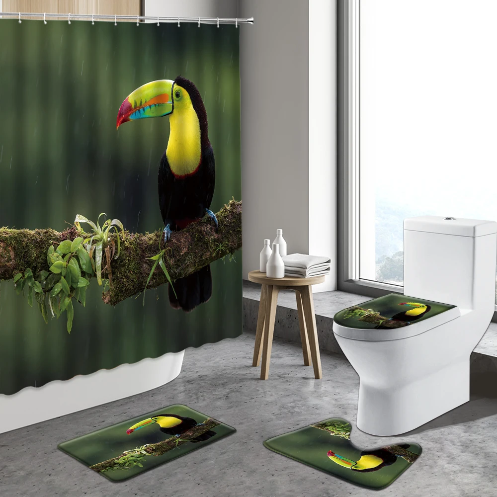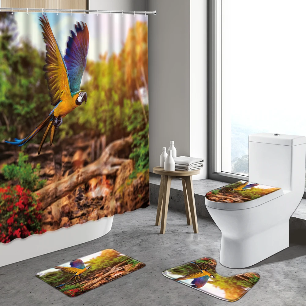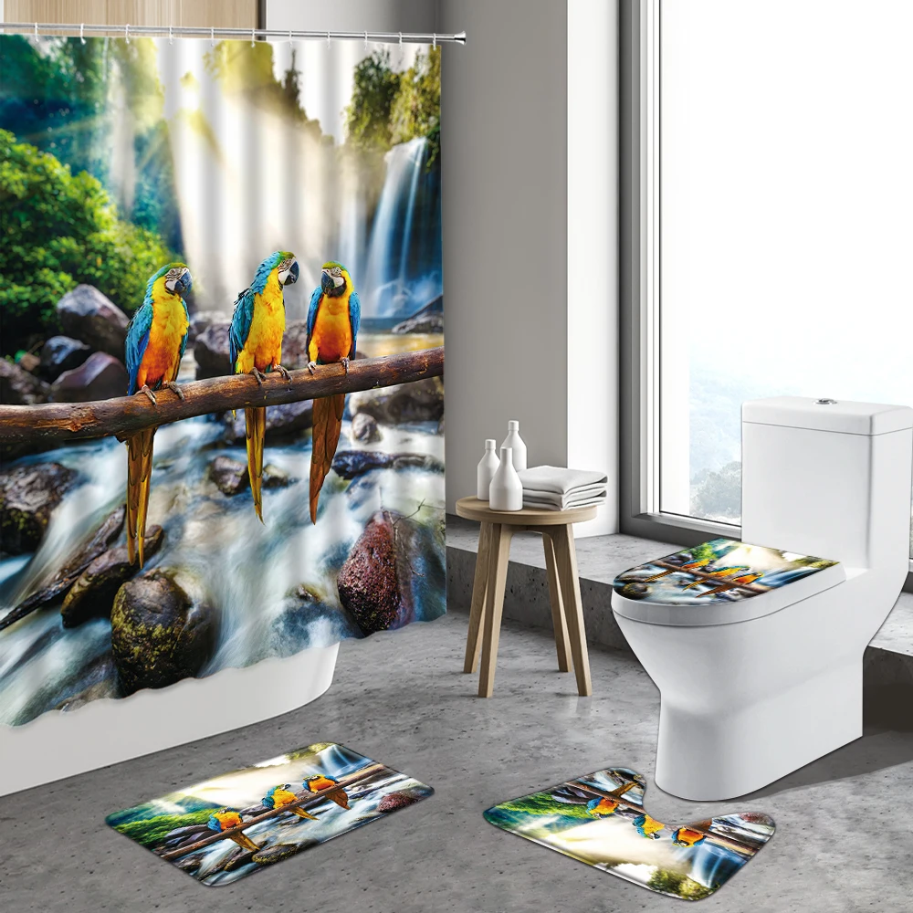Декоративная занавеска для ванной комнаты с зелеными растениями, попугаями из джунглей, занавеска с водопадом, шторы для песчаного пляжа, занавеска для душа с животными, нескользящий коврик, коврик для ванной
