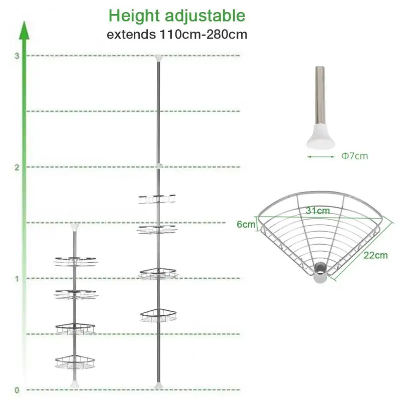 Характеристики продукта: стоящий в вертикальном положении, высота может регулироваться в соответствии с потребностями. Не нужно устанавливать, не нужно пробивать. Большая емкость, максимальная несущая способность металлического сетчатого диска составляет 10 кг, без деформации или падения, сетчатый диск изготовлен из высококачественной нержавеющей стали; его можно использовать в таких местах, как кухни, ванные комнаты и т. д.