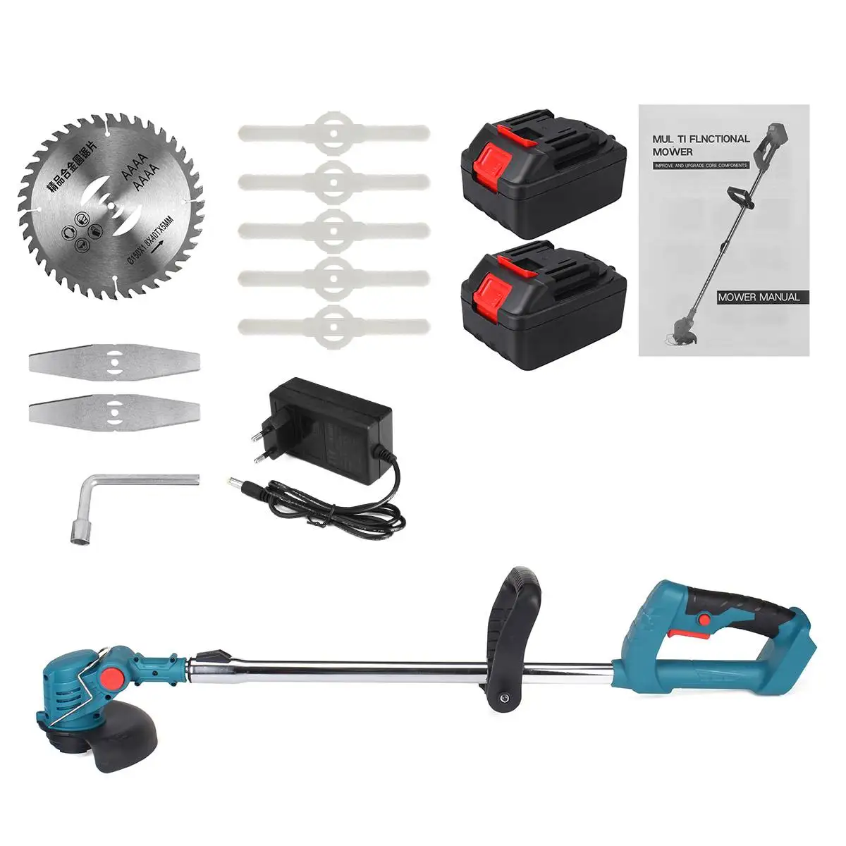 Посылка входит:1 * хост1/2 * батарея (Для аккумулятора Makita 21 в)Включает5 * пластиковое лезвие2 * металлические лезвия1 * Набор для разборки1*4-дюймовое полотно циркулярной пилы1 * Руководство пользователя на английском языке1 штекерное зарядное устройство(1 * вилка-адаптер, в зависимости от страны доставки)Посылка входит:1 * хост5 * пластиковое лезвие2 * металлические лезвия1 * Набор для разборки1*4-дюймовое полотно циркулярной пилы1 * Руководство пользователя на английском языке1 штекерное зарядное устройство(1 * вилка-адаптер, в зависимости от страны доставки)Посылка входит:1 * основание с одним роликомОсобенности:● Три лезвияПластиковые лезвия, металлические лезвия, лезвия из сплава для удовлетворения потребностей различных сценариев● Сильная мощностьНе заклинивает, легко косит на большой площади● Мощный двигатель с двумя подшипникамиПередний и задний двойные Подшипники обладают высокой мощностью, а косание более гладкое, 220 высокотемпературный эмалированный провод, высокая термостойкость и длительный срок службы● Эргономичная и удобная ручкаМягкое резиновое покрытие не имеет технологии заусенцев, его удобно держать, и оно очень удобно в использовании● Многоугольная Регулируемая косая головкаРегулируемый под разными углами, подходит для разных сцен. Скашивание, обрезка и озеленение. Удобнее в использовании, удобнее увеличивать кнопку регулировки угла● Дизайн с защитой от травыПрощайте с карточной травой, используйте более эффективно, вдали от неприятностей● Телескопическая трубкаЛегко носитьХарактеристики:Вилка (опция): вилка ЕС/вилка СШАСтиль (опция): 2/батарея/одно роликовое основаниеМощность: 650 ВтСкорость: 12000 об/минАккумулятор: для аккумулятора Makita 21 вМатериал: нейлон + стальная трубаДлина телескопическая: 86-115 см/33,9-45,3 дюйма