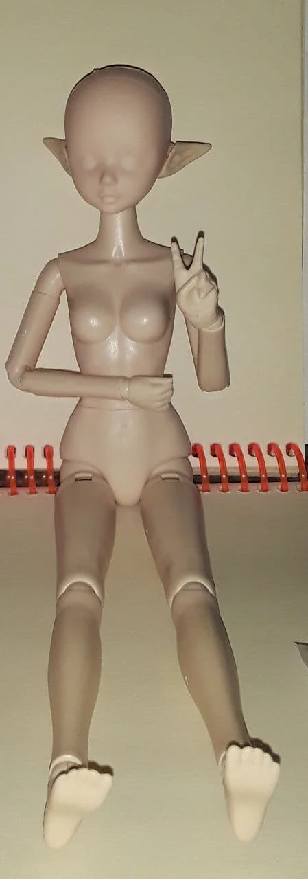 Красивое тело, хорошо проработаны детали туловища: живот, ключицы, спина итд (на моих фото этого не видно, но в реале правда заметно:)), руки и ноги похуже, выглядят несколько упрощенно. Подвижность отличная, думаю, ненамного уступает барби-йогам. Шарниры довольно свободные, кроме запястий и стоп - они очень тугие. Местами не снят облой, бедренные шарниры странноваты на вид, голова несколько пупсячья. Эльфийские уши крепятся как серьги и держатся слабо, может нужно будет погреть или приклеить. Жестовые руки скопированы с азоновских и слегка выбиваются из общего стиля. Стопа чуть шире и короче барбейской, обувь от пышек подходит. Цвет светлее неко. В целом, кукла довольно милая и интересная.