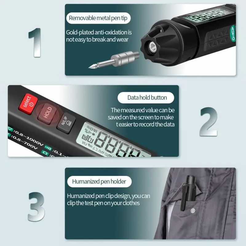 Универсальный мультиметр-ручка: Этот мультиметр отличается испытанием сопротивления/емкости/диода/частоты/температуры, непрерывности, нулевой линии и Бесконтактного обнаружения напряжения и т. д.