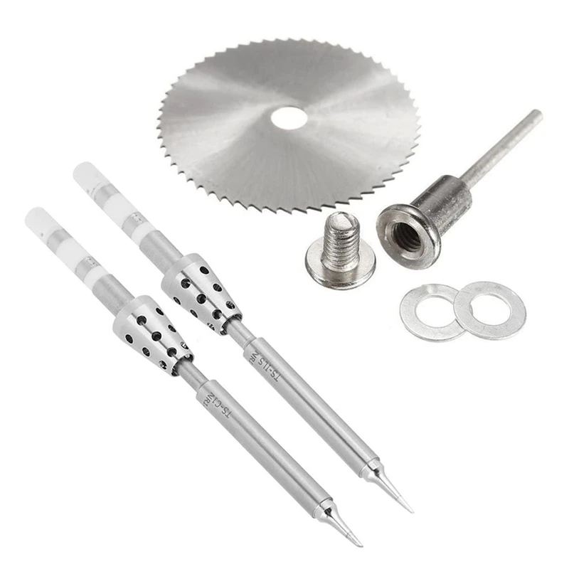 Набор 2: 2 наконечника для пайки (1 шт. каждого типа) + 7 наконечников для режущих дисков dremelДисковые режущие лезвия с закаленным стальным корпусом обеспечивают прямые, точные разрезыЛезвие для резки дисков обеспечивает более быструю резку и долгий срок службы для любителейНабор мини-циркулярная пила диски, лезвия для использования в хобби мини-дрели для небольших отрезать рабочих местВысокоскоростной набор стальных лезвий и оправок идеально подходит для точной резки алюминия, латуни, меди, дерева и пластикаНабор вращающихся инструментов для сверл, поставляется с хвостовиком[Высокая термостойкость]: Эти наконечники паяльника изготовлены из нержавеющей стали, высокая термостойкость, долговечность для длительного использования.[Быстрый нагрев]: Этот мини-Паяльник нагревается за считанные секунды с хорошей производительностью нагрева.[Специальный Запасной наконечник]: Запасной наконечник паяльника для TS100 наконечника паяльника.[Применение]: подходит для электронного производства и электрического обслуживания, таких как мобильный телефон, компьютер и т. д.[Размеры]: паяльное жало Длина: 10,8 см/4.25in (T1-C), 10,7 см/4.21in (TS-ILS)Цвет: серебристыйМатериал: металл/медьРазмер: Длина: 10,7 смПосылка:2 наконечника для пайки (1 шт. каждого типа)7 x для отрезных дисков dremelТолько вышеуказанная посылка, другие товары не включены.Примечание: светильник и различные дисплеи могут привести к тому, что цвет товара на картинке немного отличается от реального. Допускается погрешность в измерениях +/- 1-3 см.