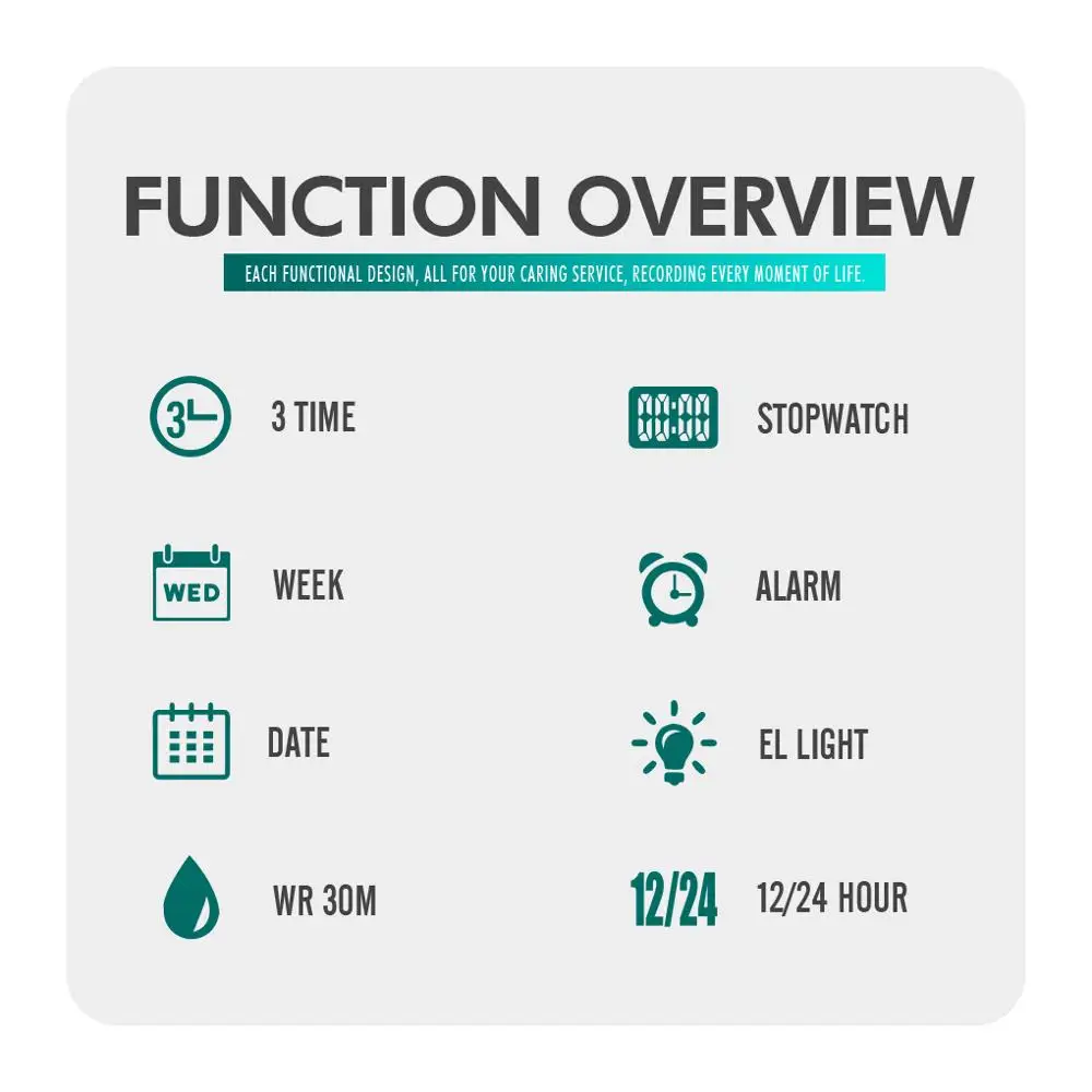 Функции: 3 раза, секундомер, подсветка, отображение даты, таймер будильника, отображение недели, ежечасный час, система 12/24 часов