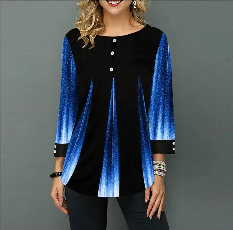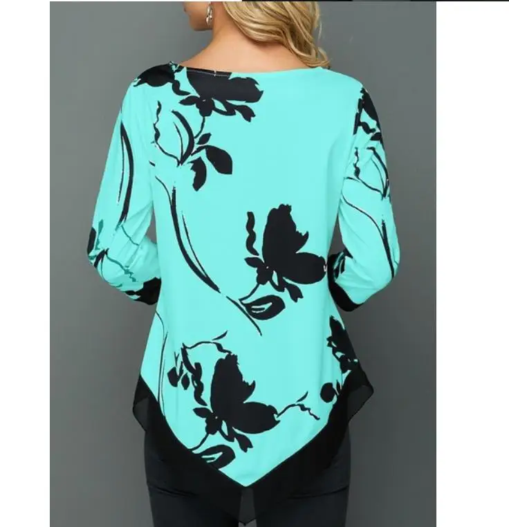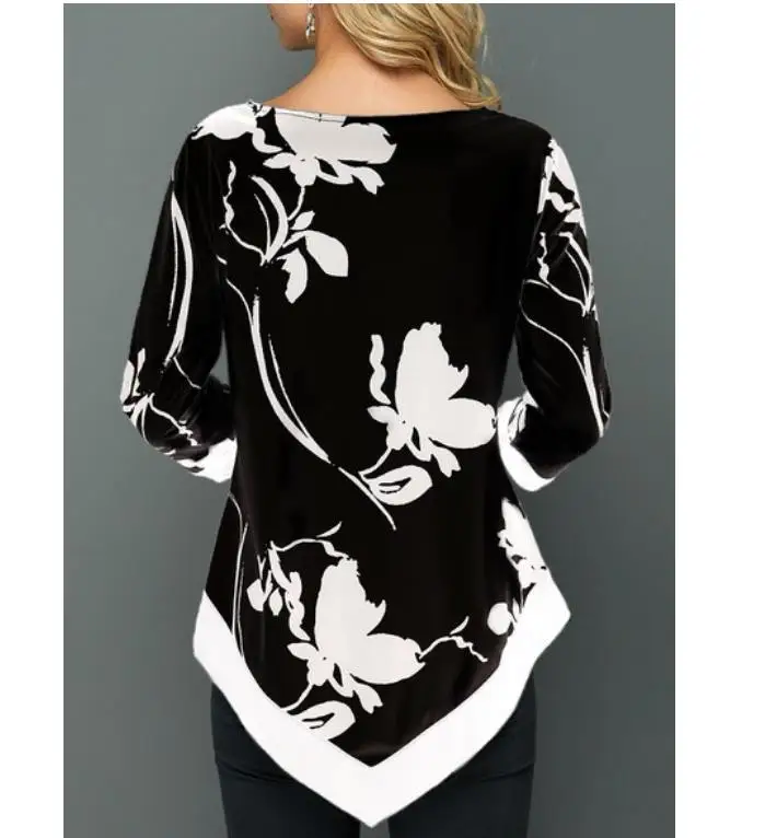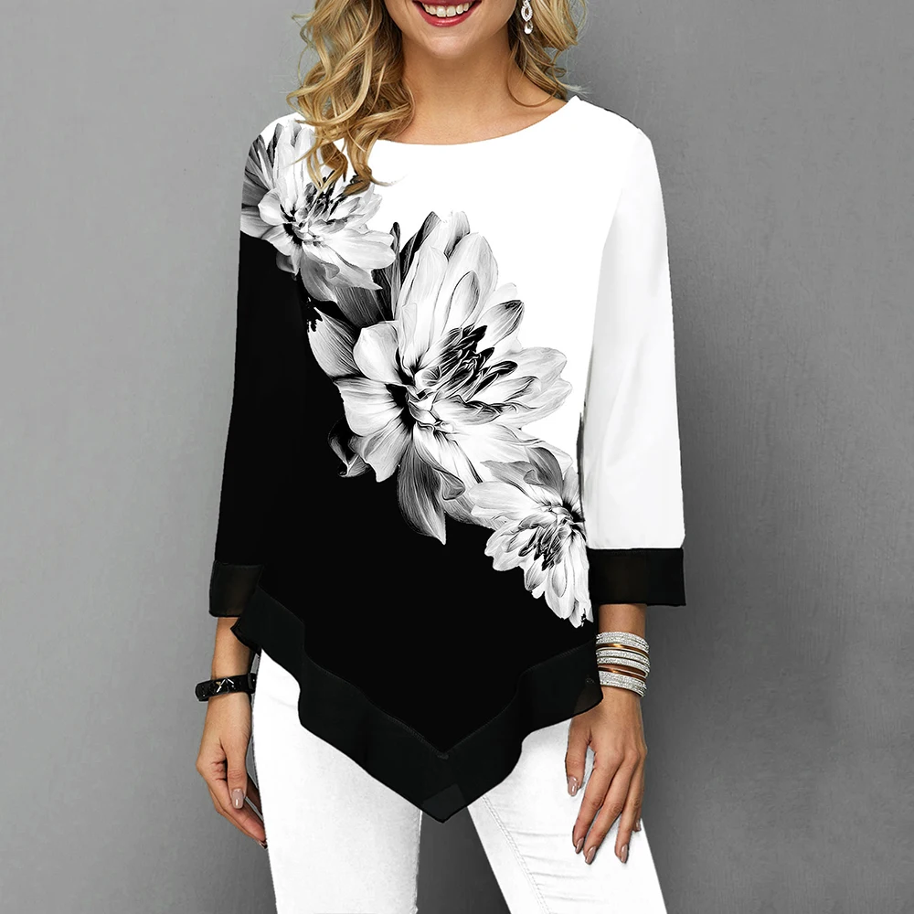 Женская блузка с цветочным принтом, Асимметричная рубашка с круглым вырезом и длинным рукавом, летний женский пуловер, топы, модные женские блузки