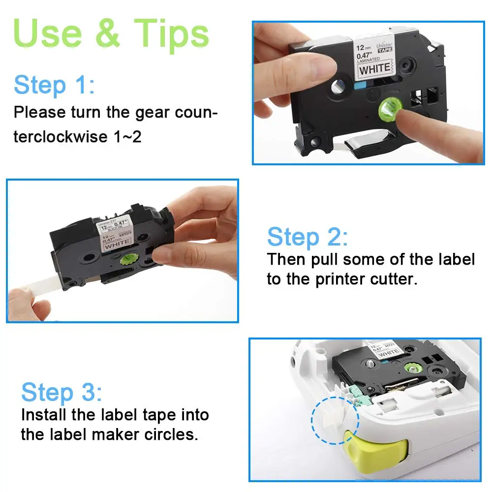 Простота в использовании/легко очищается и наносится/отлично выглядит/долговечные этикеткиПожалуйста, поверните шестерню в направлении, указанном стрелкой на ленте, для примерно 1-2 кругов (счетчик часов мудрого поворота) затянуть ленту перед установкой ленты aze в принтеры этикеток и избежать каких-либо трещин или варенья ленты.Не вытягивайте бумагу для этикеток и не прикасайтесь к машине для этикеток, пока лента не будет заполнена без печати.Перед окончанием печати, пожалуйста, не прикасайтесь к резаку этикеток, чтобы избежать каких-либо ошибок.