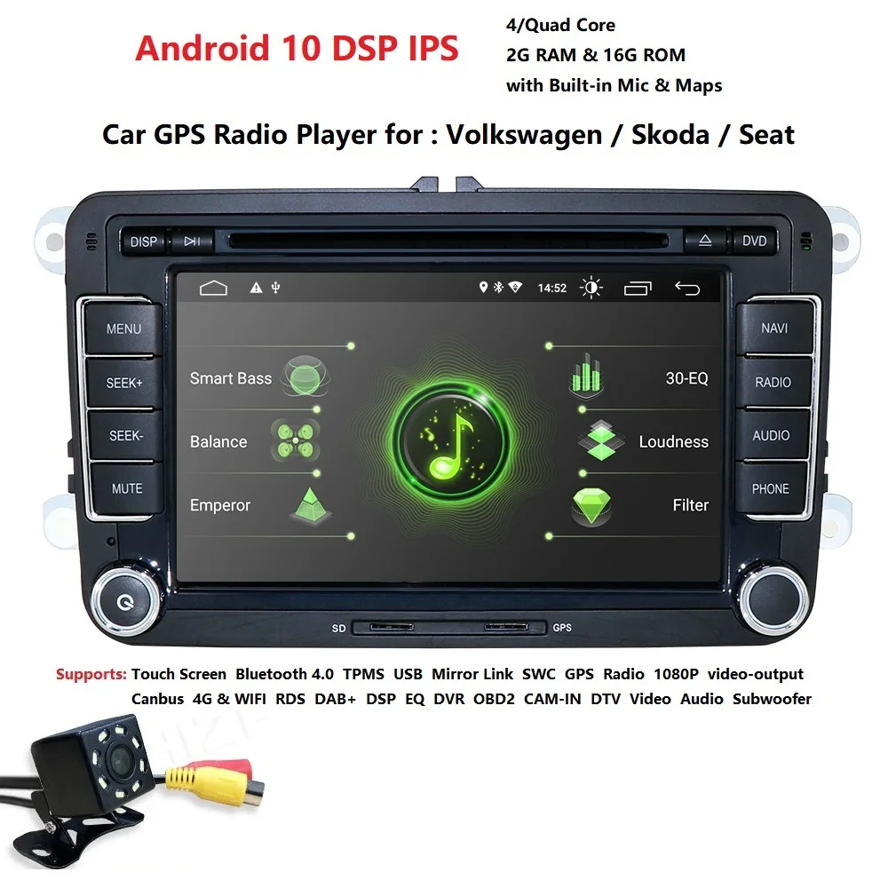 Автомобильный радиоприемник с четырехъядерным процессором Android 10 для VW Volkswagen Golf Polo Tiguan Passat Leon Skoda Octavia GPS мультимедийный плеер DSP BT DVD 2Din