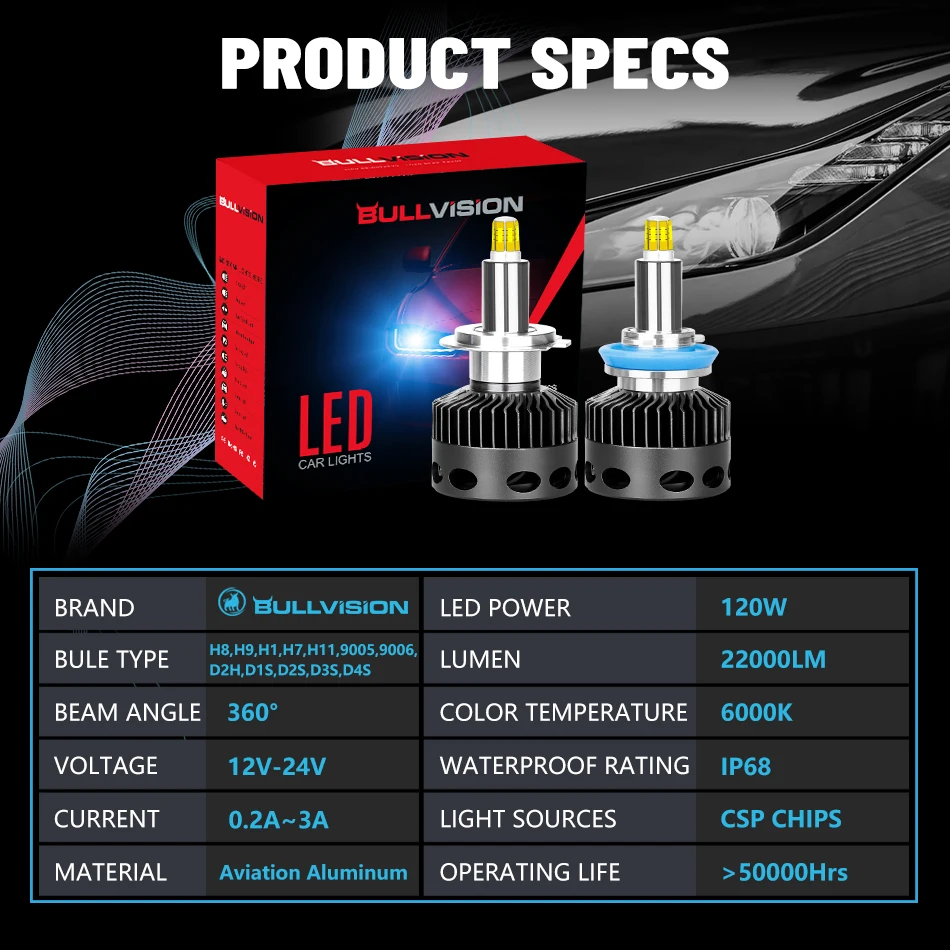 Светодиодные фары H7 светодиодный D1S D2S D3S D4S D2H 22000LM 360 градусов CSP чипы светодиодный H1 H11 H8 H9 9005 9006 HB3 HB4 CAN-шина без ошибок 6000K 12 В