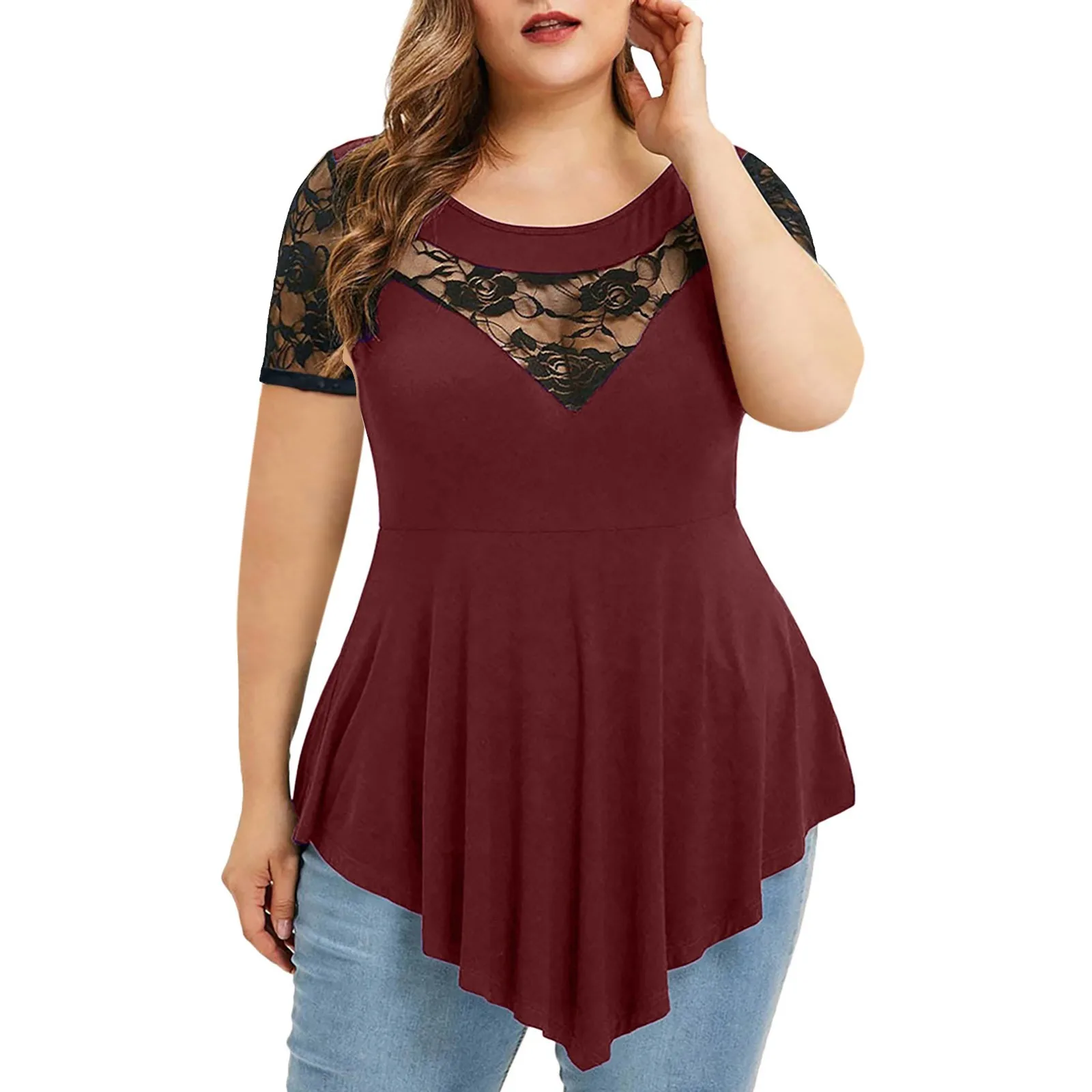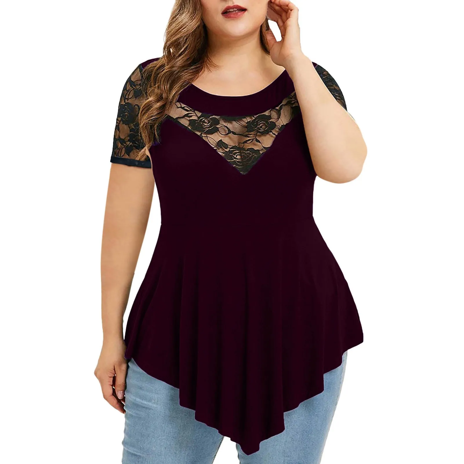 Кружевные топы для женщин, 5xl, размера плюс, черные, летние, однотонные, цветочные, кружевные, с круглым вырезом, асимметричные, Блузка три четверти, 2021