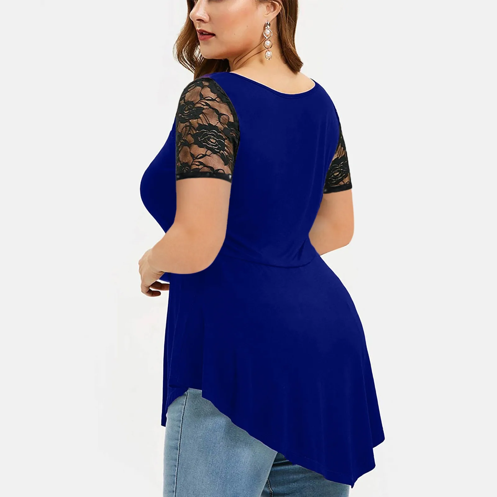Размера плюс женская однотонная Цветочная кружевная Асимметричная блузка с круглым вырезом и тремя четвертями