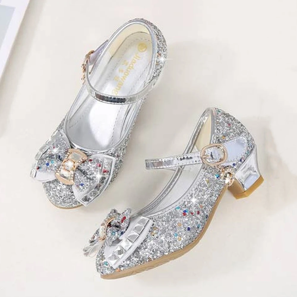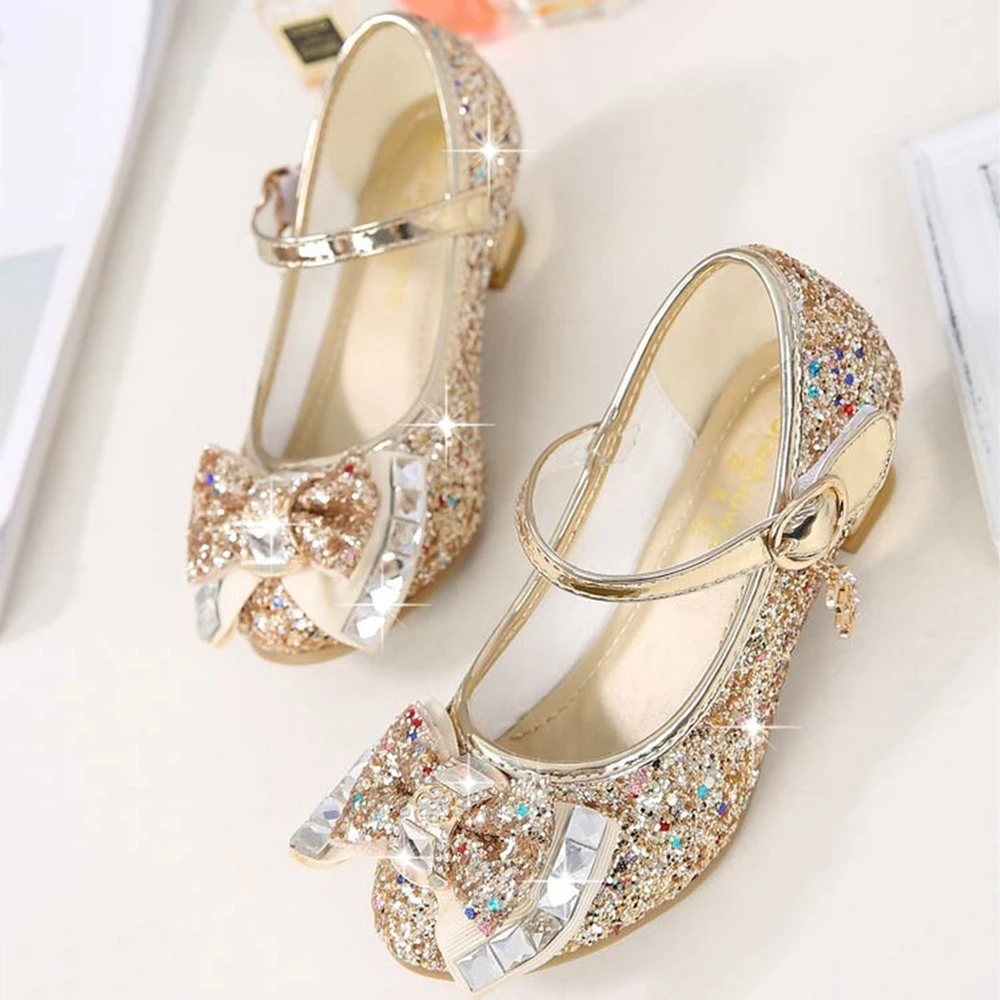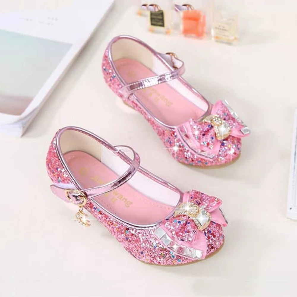 Туфли принцессы Детские кожаные с блестками, повседневная обувь для девочек, на высоком каблуке, украшенные стразами, с бантом-бабочкой, с цветком