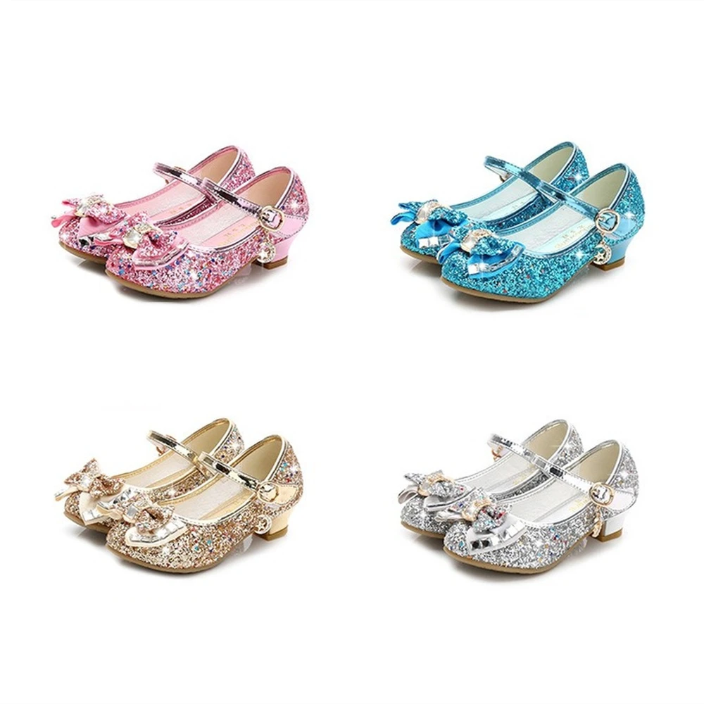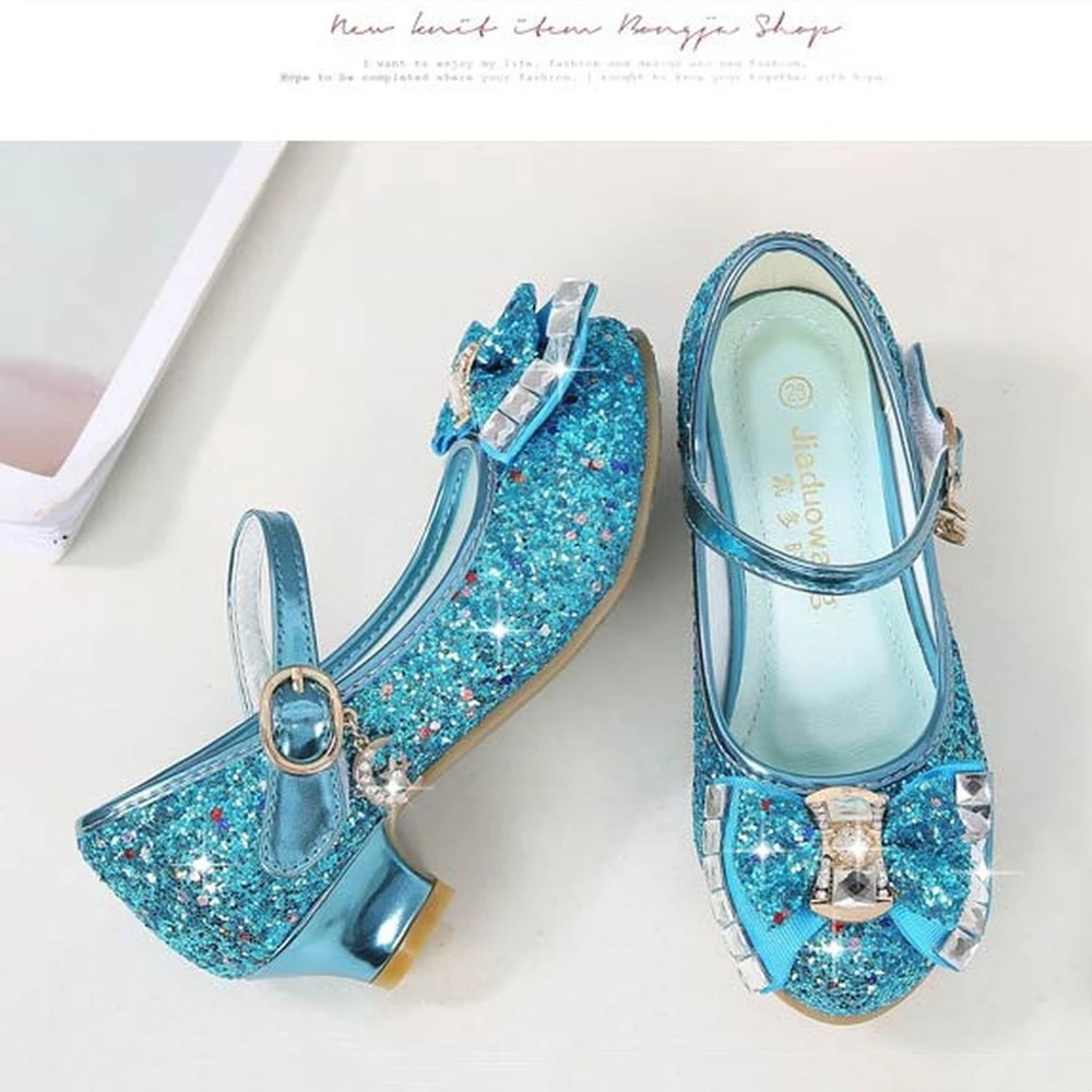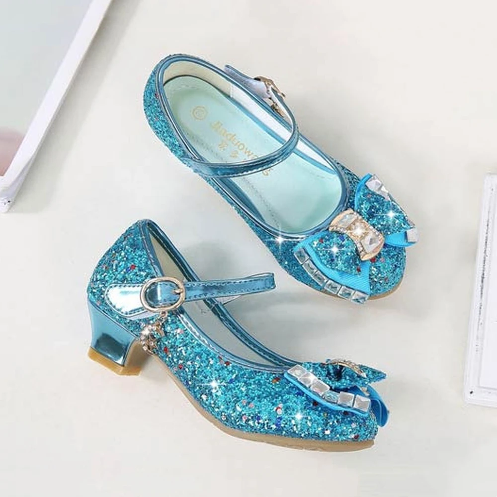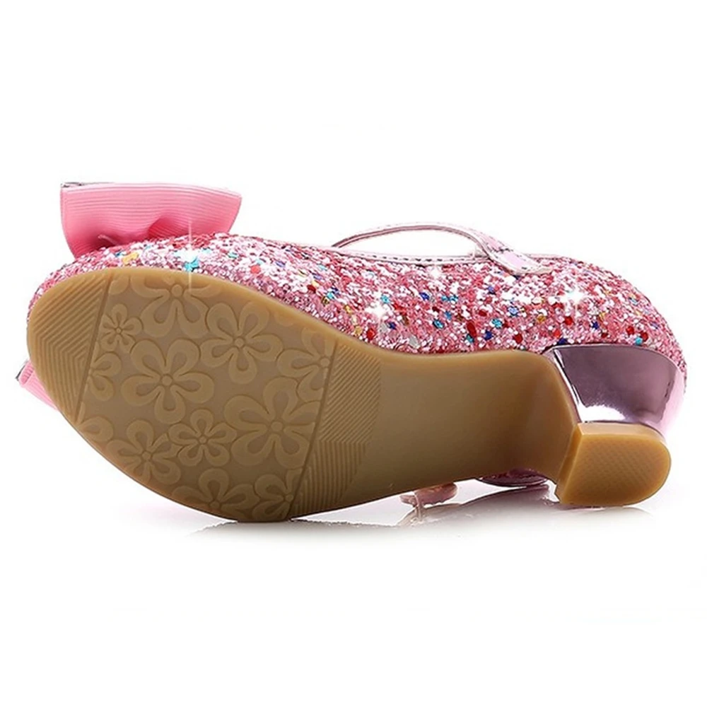 Туфли принцессы Детские кожаные с блестками, повседневная обувь для девочек, на высоком каблуке, украшенные стразами, с бантом-бабочкой, с цветком