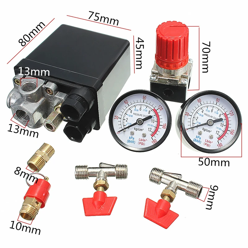 175psi воздушный компрессор, клапан давления насоса, вертикальный перекрестный контрольный переключатель 12 бар 240 в, регулятор сброса коллектора с переключателем манометров