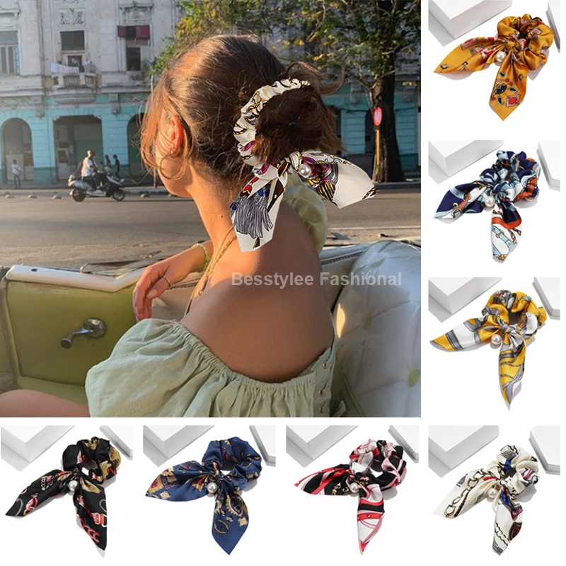 Резинки для волос шифоновые эластичные с геометрическим принтом и бантом