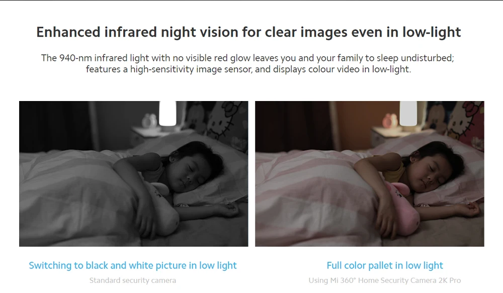 Инфракрасный светильник 940-нм без видимого Красного свечения позволяет вам и вашей семье спать без беспокойства; Оснащен высокочувствительным датчиком изображения, записывает и отображает цветное видео даже в условиях, когда светильник находится на низком уровне.
