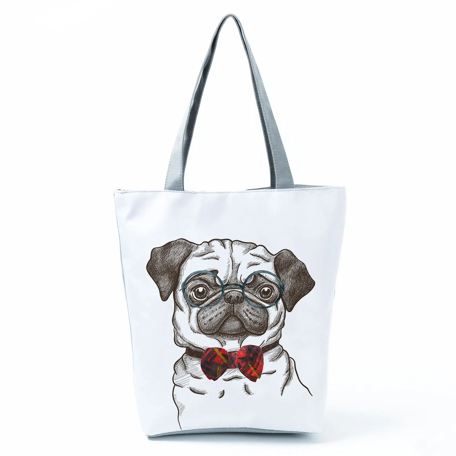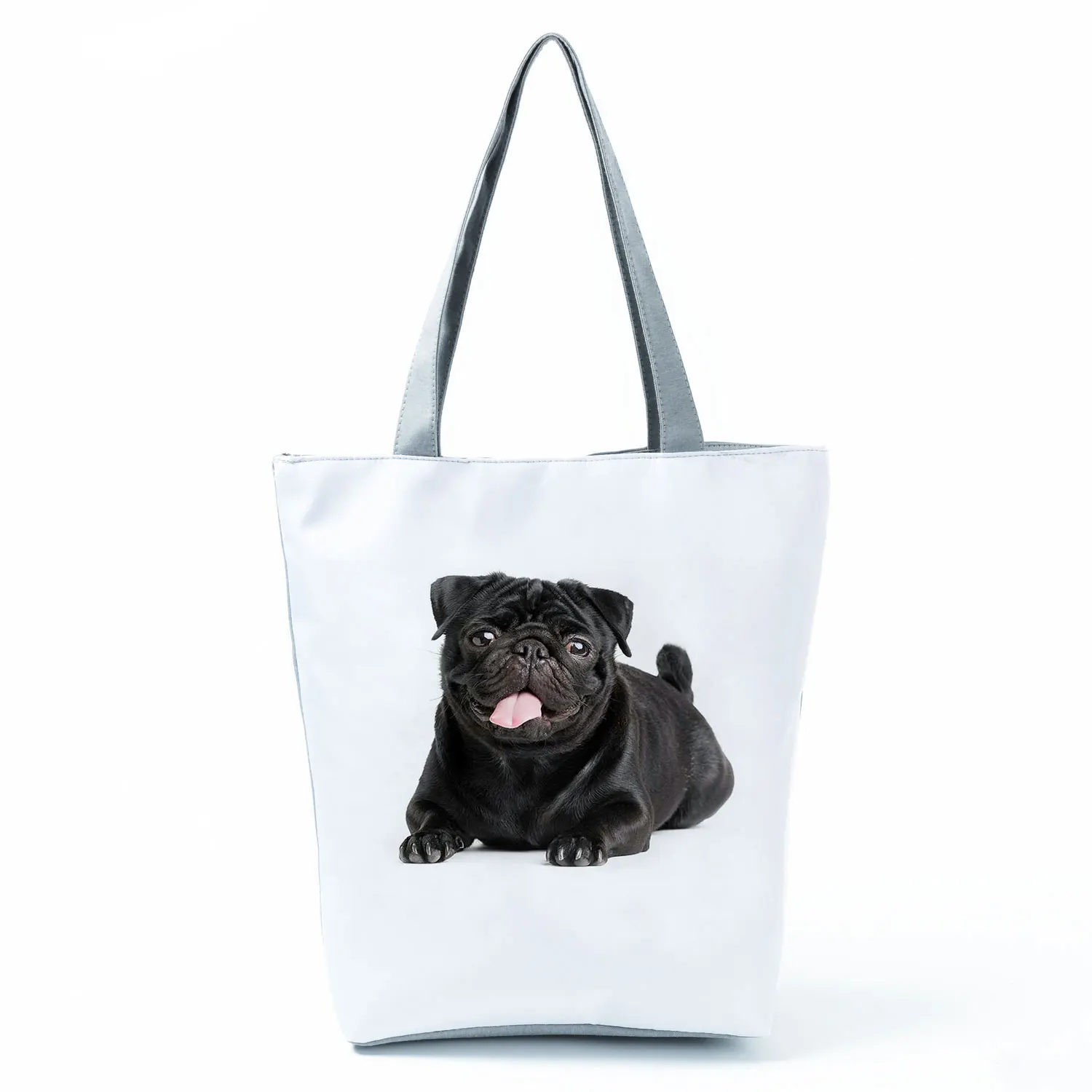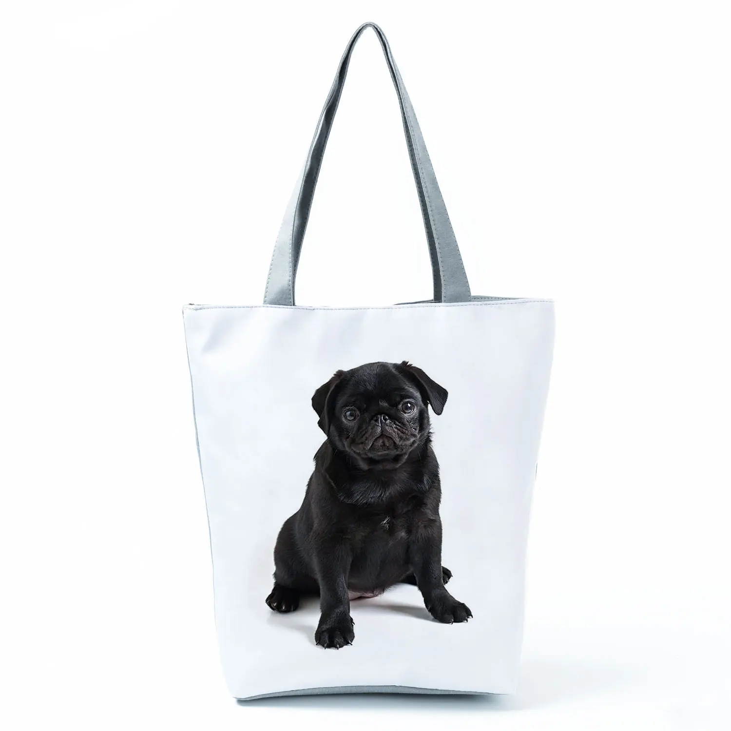 Сумка-тоут женская с принтом мопса, экологически чистая Складная Сумочка на плечо, практичная портативная шоппер, черный цвет, белый цвет
