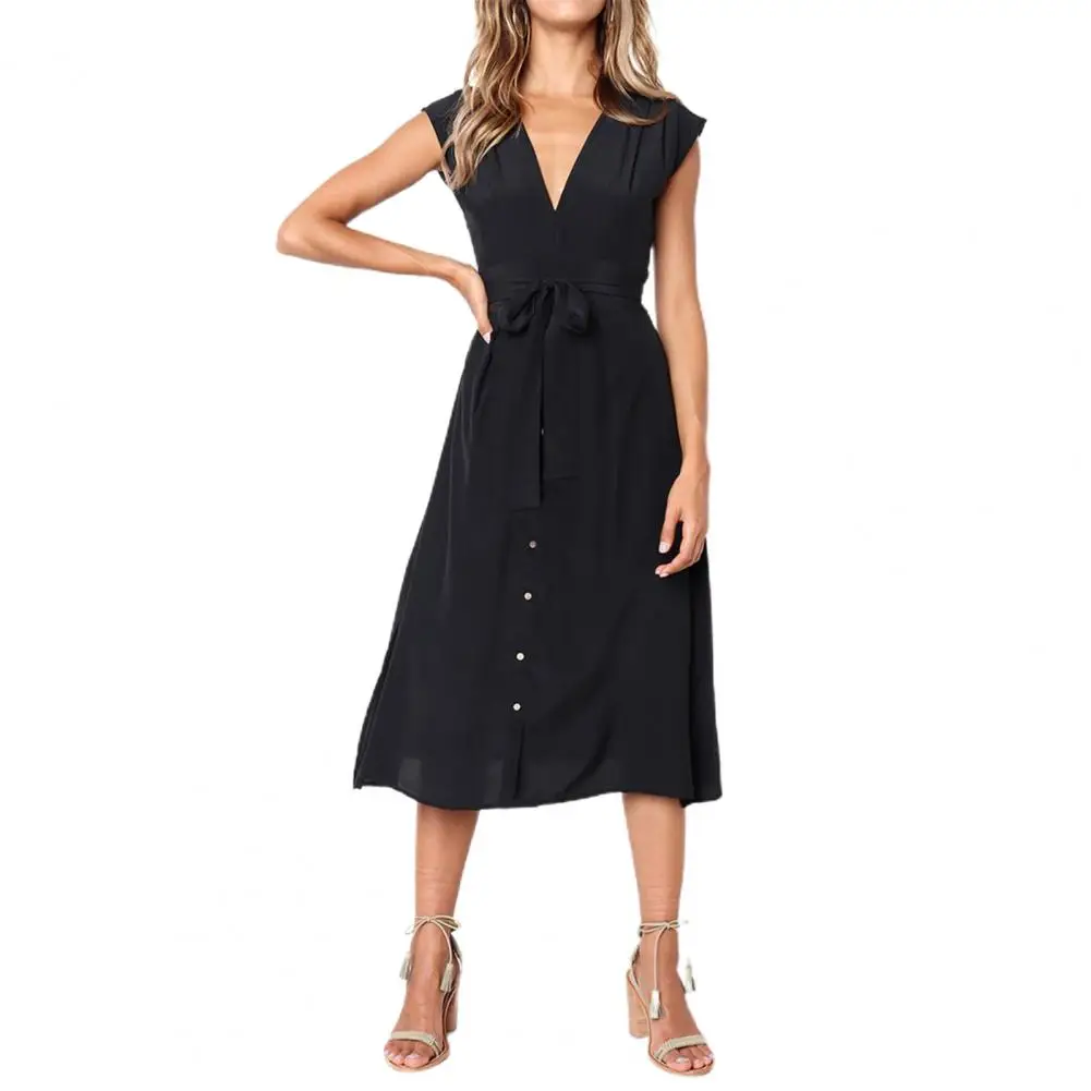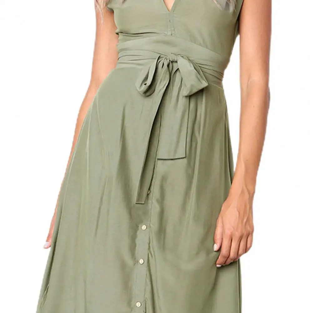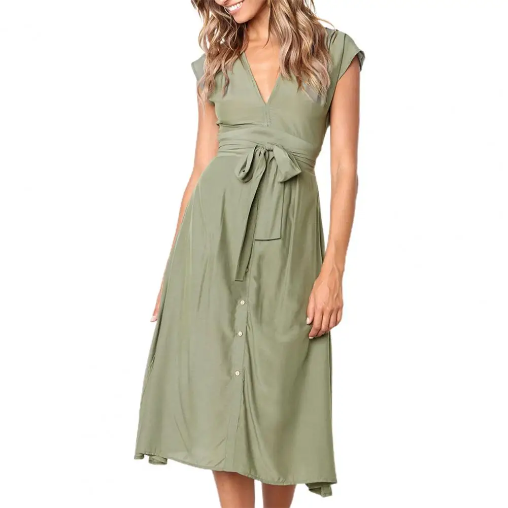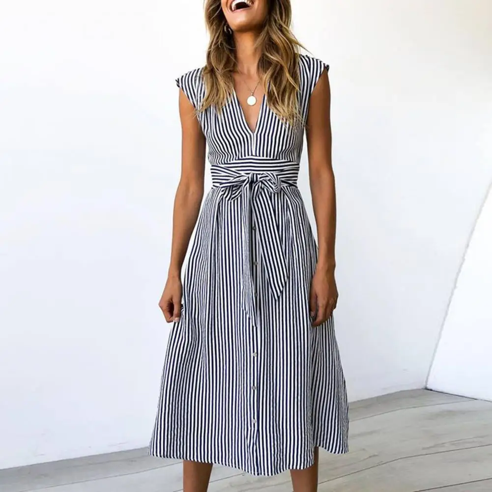 Женское платье в полоску с завязкой на талии, летняя юбка с V-образным вырезом и пуговицами для свиданий